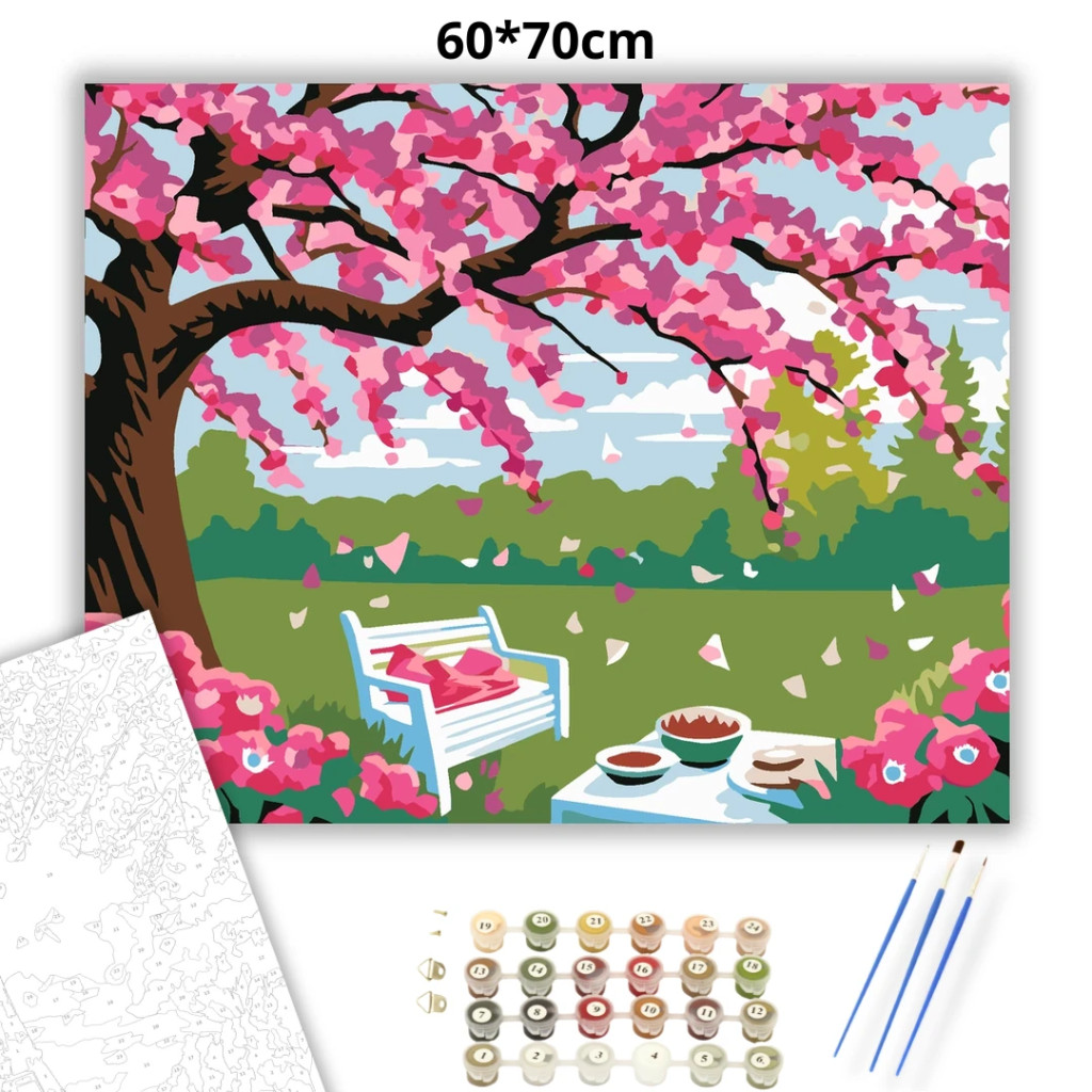 Egy tavaszi piknikjelenet látható egy virágzó szilvafa alatt, ahol a szirmok finoman hullanak a fűre. A kertben egy fehér pad és egy megterített asztal idézi a nyugodt, pihentető délutánt. A rózsaszín virágok és a friss zöld háttér igazán üde hangulatot adnak a képnek. Varázsolj egyedi hangulatot otthonodba ezzel a gyönyörű számfestő készlettel, amely tökéletes ajándék is lehet szeretteid számára. A csomag mindent tartalmaz, amire szükséged van ahhoz, hogy saját kezűleg alkoss egy lenyűgöző festményt.
