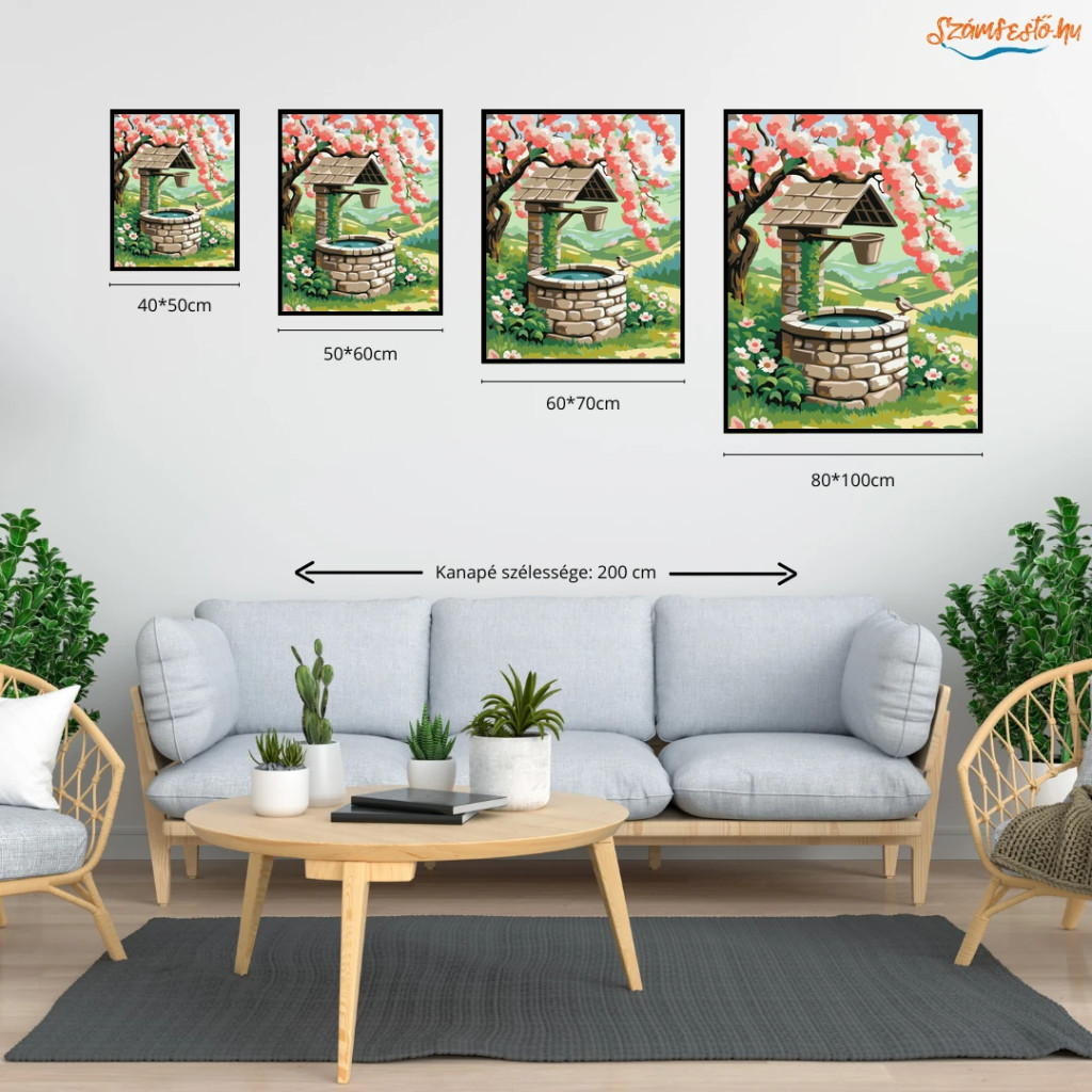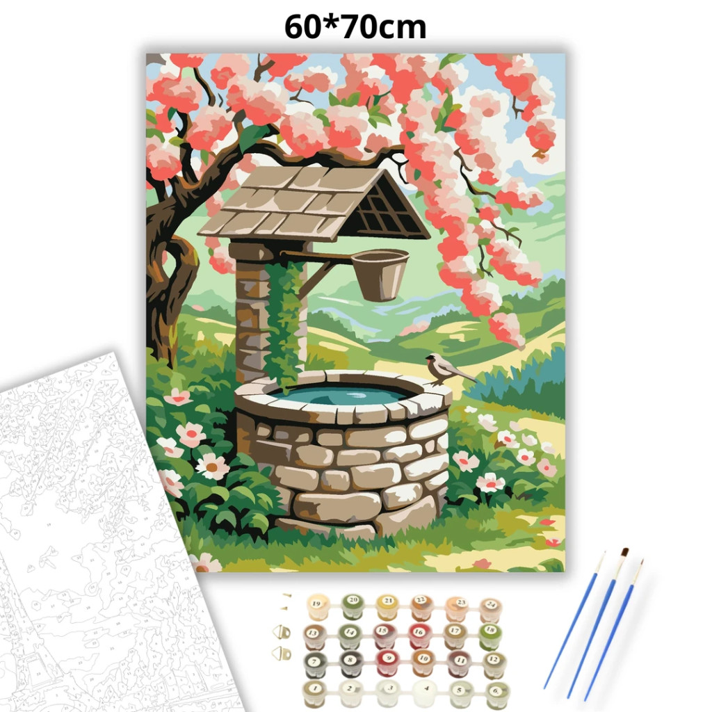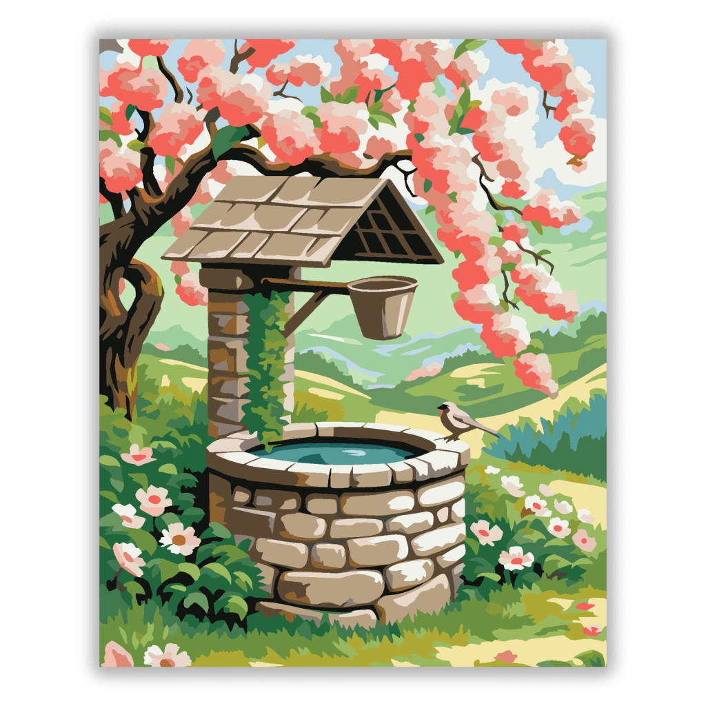 A képen egy régi kőből rakott kút látható, fölé hajló, virágzó barackfával. A kút peremén egy kis madár pihen, körülötte tavaszi virágok és zöld dombok terülnek el. A látvány nyugodt, friss és üde hangulatot áraszt. Varázsolj egyedi hangulatot otthonodba ezzel a gyönyörű számfestő készlettel, amely tökéletes ajándék is lehet szeretteid számára. A csomag mindent tartalmaz, amire szükséged van ahhoz, hogy saját kezűleg alkoss egy lenyűgöző festményt.