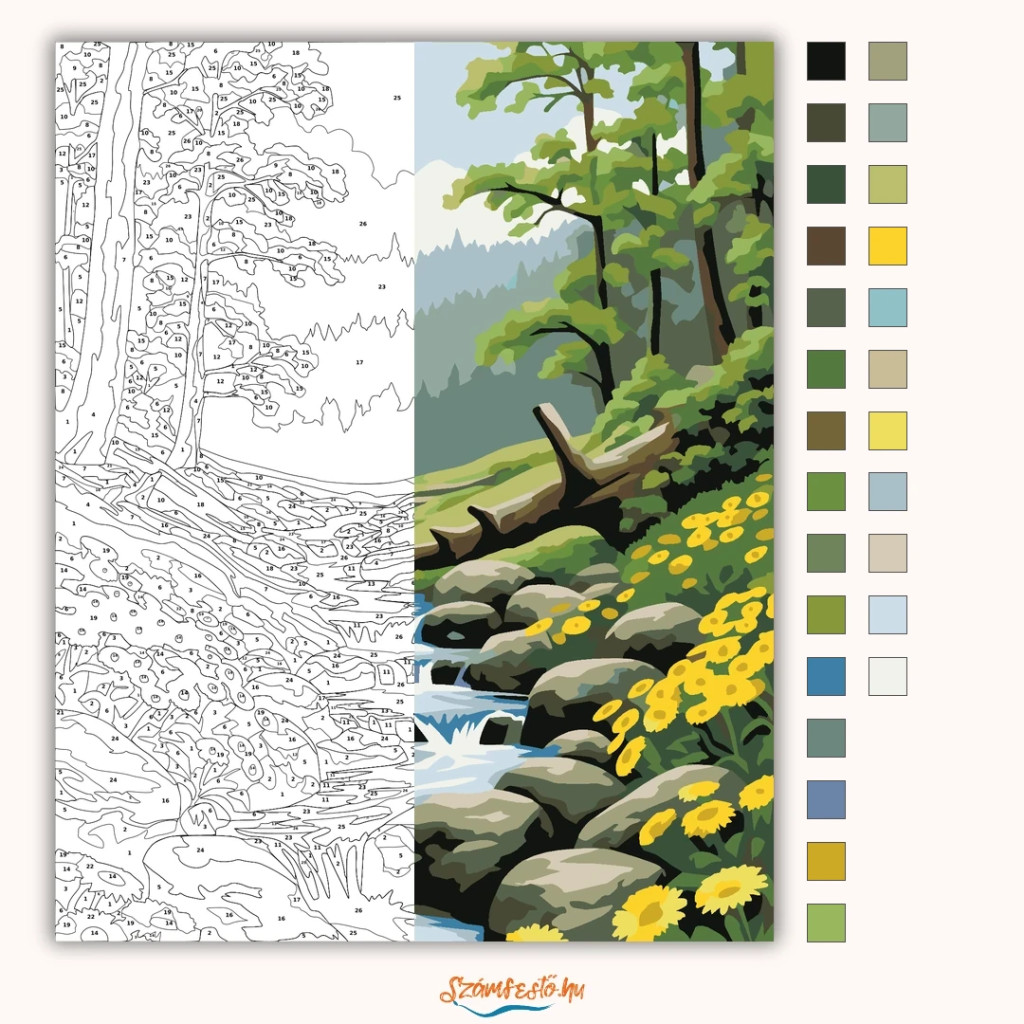 A képen egy hűvös hegyi patak csörgedezik sima kövek között, apró vízesésekkel a mederben. A partokat friss tavaszi lombú fák és sárga vadvirágok szegélyezik, a háttérben ködös hegyvonulatokkal. Nyugodt, üde erdei hangulatot áraszt, mintha egy tiszta levegőjű kirándulás pillanatát látnád. Varázsolj egyedi hangulatot otthonodba ezzel a gyönyörű számfestő készlettel, amely tökéletes ajándék is lehet szeretteid számára. A csomag mindent tartalmaz, amire szükséged van ahhoz, hogy saját kezűleg alkoss egy lenyűgöző festményt.
