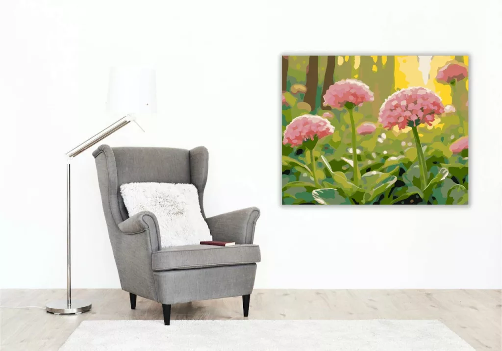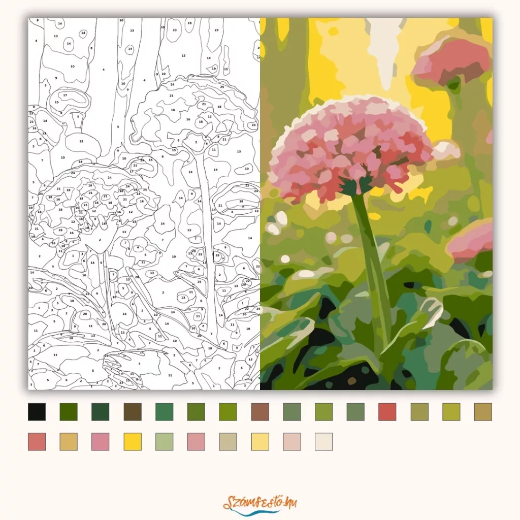A képen közeli nézetben látható a virágzó vad lóhere, apró, gömbös fürtökbe rendeződő virágokkal. A rózsaszínes virágfejeket dús zöld levelek veszik körül, a háttérben lágyan elmosódó növényzettel. Friss, tavaszi hangulatú kép, sok természetes fénnyel. Legyen a lakásod dísze vagy egy kedves meglepetés valaki számára – ez a számfestő készlet tökéletes választás mindkettőre. A készletben mindent megtalálsz, amivel lépésről lépésre megalkotható ez a gyönyörű festmény.