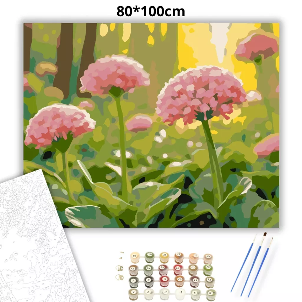 A képen közeli nézetben látható a virágzó vad lóhere, apró, gömbös fürtökbe rendeződő virágokkal. A rózsaszínes virágfejeket dús zöld levelek veszik körül, a háttérben lágyan elmosódó növényzettel. Friss, tavaszi hangulatú kép, sok természetes fénnyel. Díszítsd otthonodat saját kézzel készített műalkotással, vagy ajándékozd meg szeretteidet egy igazán különleges élménnyel! A számfestő készletben minden szükséges eszköz megtalálható a festmény elkészítéséhez.