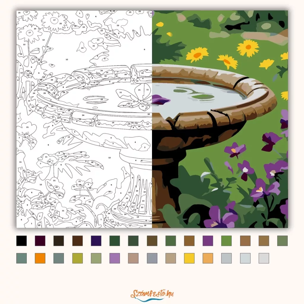 A képen egy megrepedt kerti madáritató látható, amelyet esővíz tölt meg, a felszínén egy lila virággal. Körülötte burjánzó tavaszi kert nyílik sárga és lila virágokkal. Nyugodt, friss hangulatú jelenet természetközeli színekkel. Legyen a lakásod dísze vagy egy kedves meglepetés valaki számára – ez a számfestő készlet tökéletes választás mindkettőre. A készletben mindent megtalálsz, amivel lépésről lépésre megalkotható ez a gyönyörű festmény.