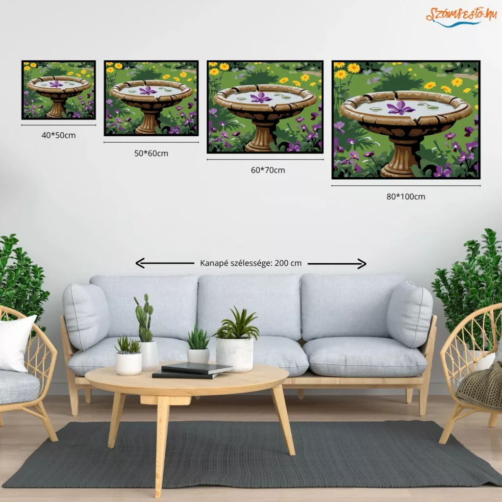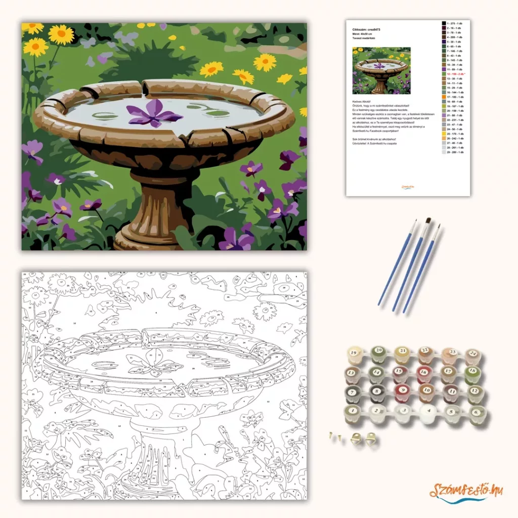 A képen egy megrepedt kerti madáritató látható, amelyet esővíz tölt meg, a felszínén egy lila virággal. Körülötte burjánzó tavaszi kert nyílik sárga és lila virágokkal. Nyugodt, friss hangulatú jelenet természetközeli színekkel. Ez a számfestő készlet tökéletes választás, ha egyedi dekorációval tennéd szebbé otthonodat, vagy ha különleges ajándékot keresel. A csomagban minden megtalálható, amire a festéshez szükséged van.