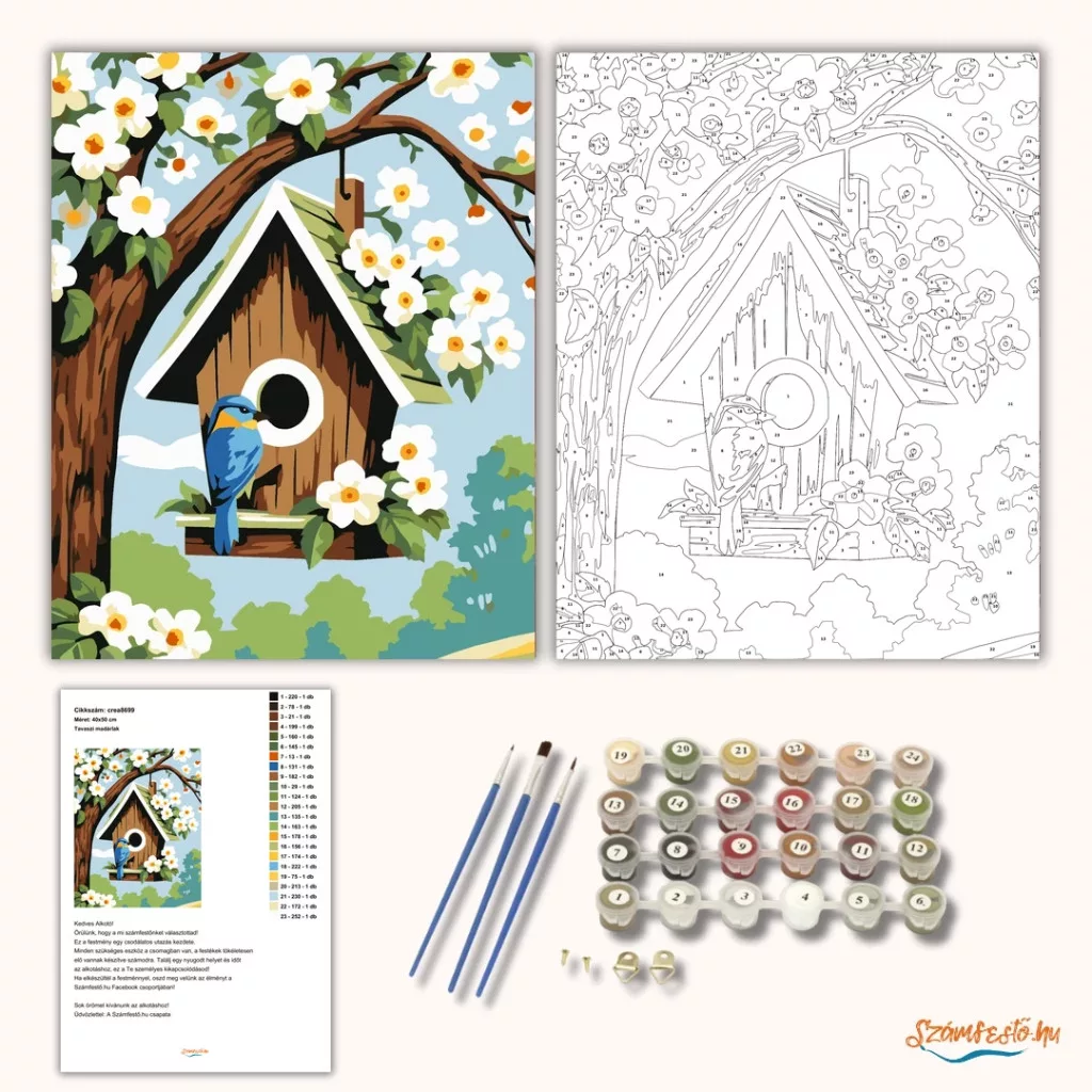 A képen egy virágzó almafán lógó madárház látható, az odú bejáratánál egy kék madárral. A fehér virágok és a friss zöld levelek igazi tavaszi, derűs hangulatot adnak. A világos égbolt és a természet közelsége nyugodt, otthonos látványt teremt. Engedd szabadjára a kreativitásodat, és alkoss egy különleges műalkotást, amely otthonod dísze lehet de egyedi ajándékként is kiváló. A számfestő készletben minden szükséges eszközt megtalálsz a tökéletes végeredményhez.