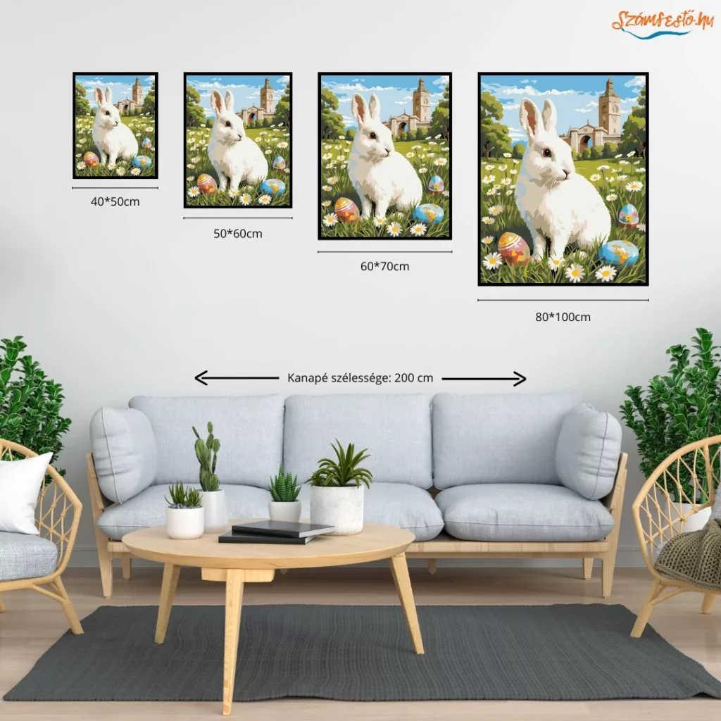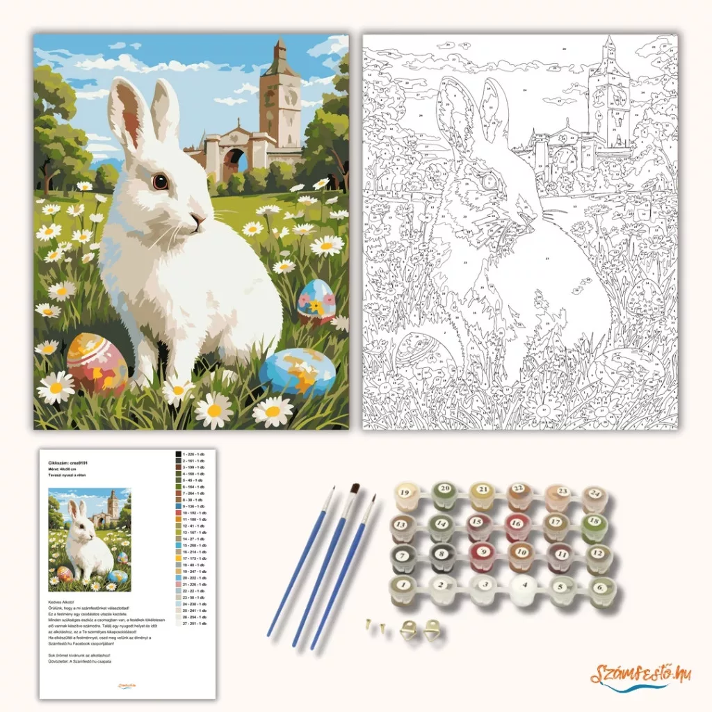 A képen egy fehér nyuszi látható egy virágos réten, körülötte festett húsvéti tojásokkal. A háttérben fák és egy tornyos, kapus épület rajzolódik ki a felhős ég alatt. Az összhatás vidám, tavaszias és mesésen nyugodt. Legyen a lakásod dísze vagy egy kedves meglepetés valaki számára – ez a számfestő készlet tökéletes választás mindkettőre. A készletben mindent megtalálsz, amivel lépésről lépésre megalkotható ez a gyönyörű festmény.