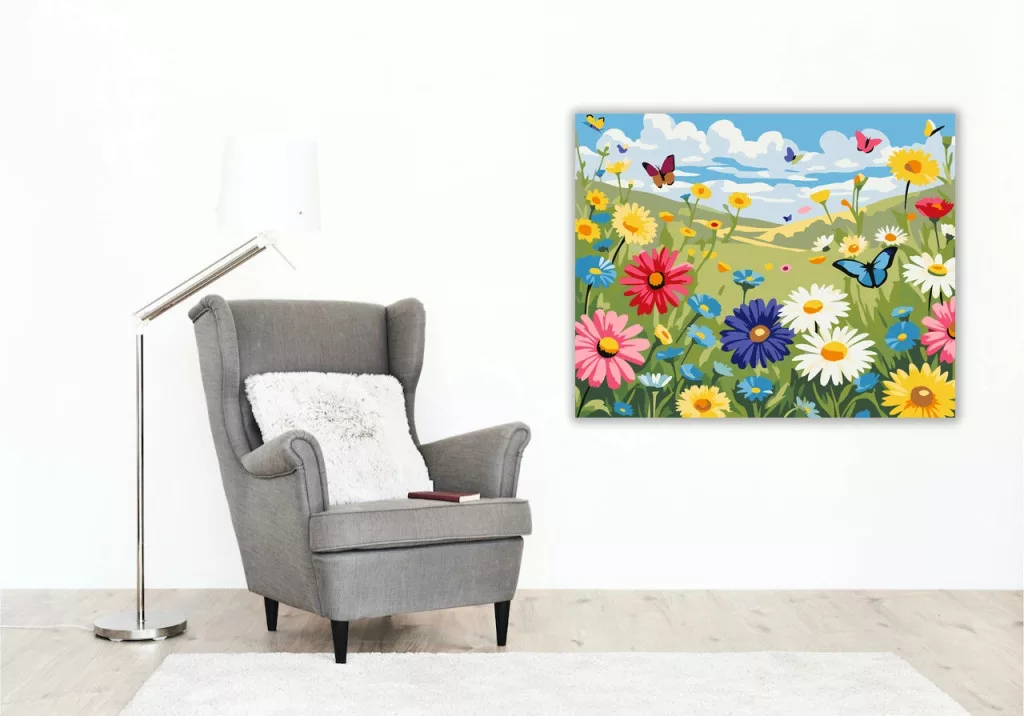 A képen egy tavaszi, virágzó rét látható sokféle vadvirággal, a háttérben lankás dombokkal és felhős éggel. A virágok között több pillangó repül, ami könnyed, vidám hangulatot ad a jelenetnek. Élénk, napfényes színek és friss, természetközeli látvány jellemzi. Varázsolj egyedi hangulatot otthonodba ezzel a gyönyörű számfestő készlettel, amely tökéletes ajándék is lehet szeretteid számára. A csomag mindent tartalmaz, amire szükséged van ahhoz, hogy saját kezűleg alkoss egy lenyűgöző festményt.