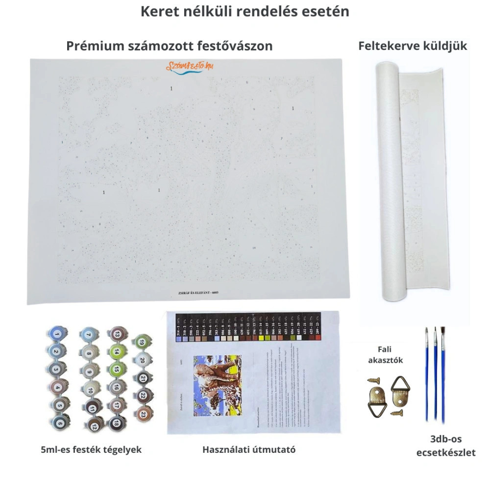 • Festővászon: Számozott rajzzal előnyomott vászon, az általad választott méretben. Elérhető keret nélkül (tekercselt) vagy keretre feszítve (vakrámán).