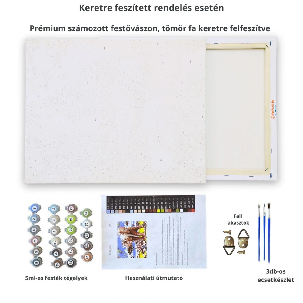 • Festővászon: Számozott rajzzal előnyomott vászon, az általad választott méretben. Elérhető keret nélkül (tekercselt) vagy keretre feszítve (vakrámán).