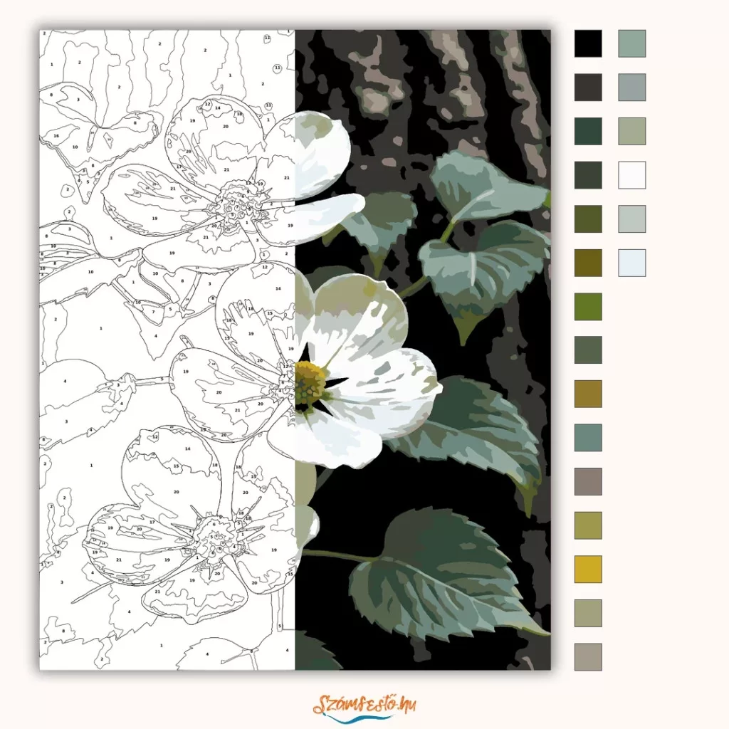 A képen fehér somvirágok láthatók egy sötét fatörzs előtt, zöld levelekkel körülvéve. A világos szirmok szépen kiemelkednek a mély háttérből, friss tavaszi hangulatot adva. Természetközeli, nyugodt látvány, ami jól mutat bármelyik szobában. Díszítsd otthonodat saját kézzel készített műalkotással, vagy ajándékozd meg szeretteidet egy igazán különleges élménnyel! A számfestő készletben minden szükséges eszköz megtalálható a festmény elkészítéséhez.