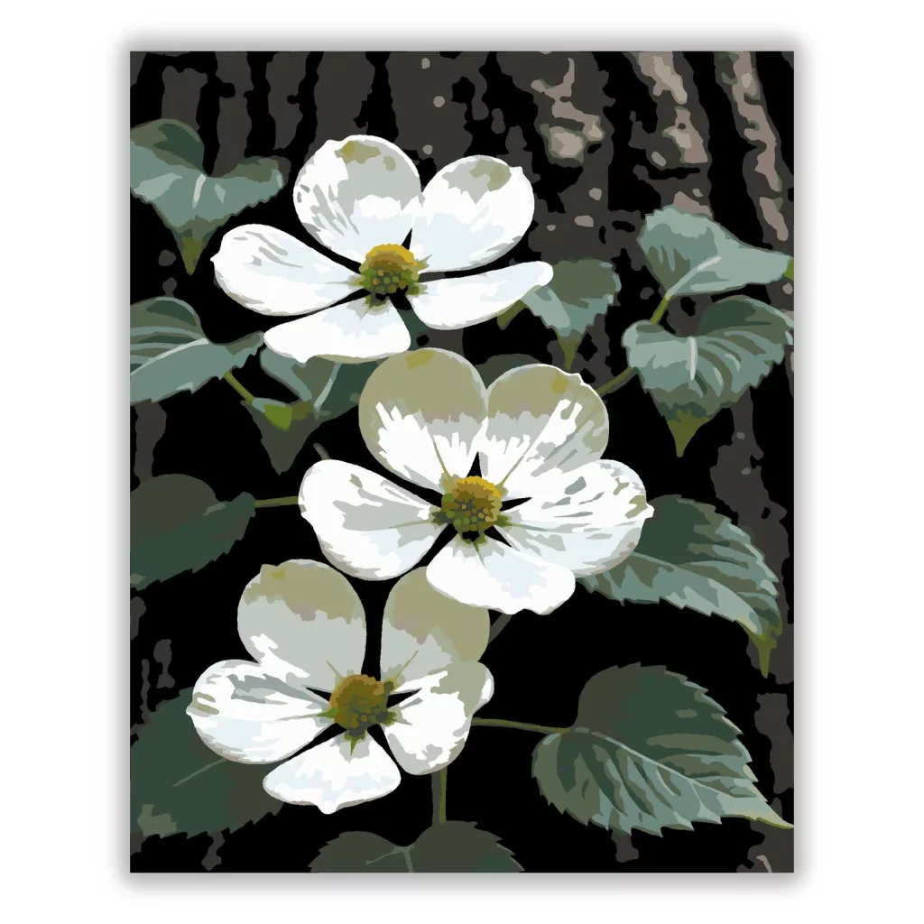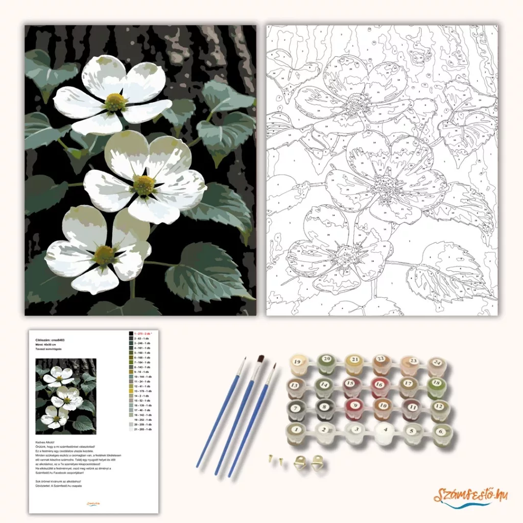 A képen fehér somvirágok láthatók egy sötét fatörzs előtt, zöld levelekkel körülvéve. A világos szirmok szépen kiemelkednek a mély háttérből, friss tavaszi hangulatot adva. Természetközeli, nyugodt látvány, ami jól mutat bármelyik szobában. Legyen a lakásod dísze vagy egy kedves meglepetés valaki számára – ez a számfestő készlet tökéletes választás mindkettőre. A készletben mindent megtalálsz, amivel lépésről lépésre megalkotható ez a gyönyörű festmény.