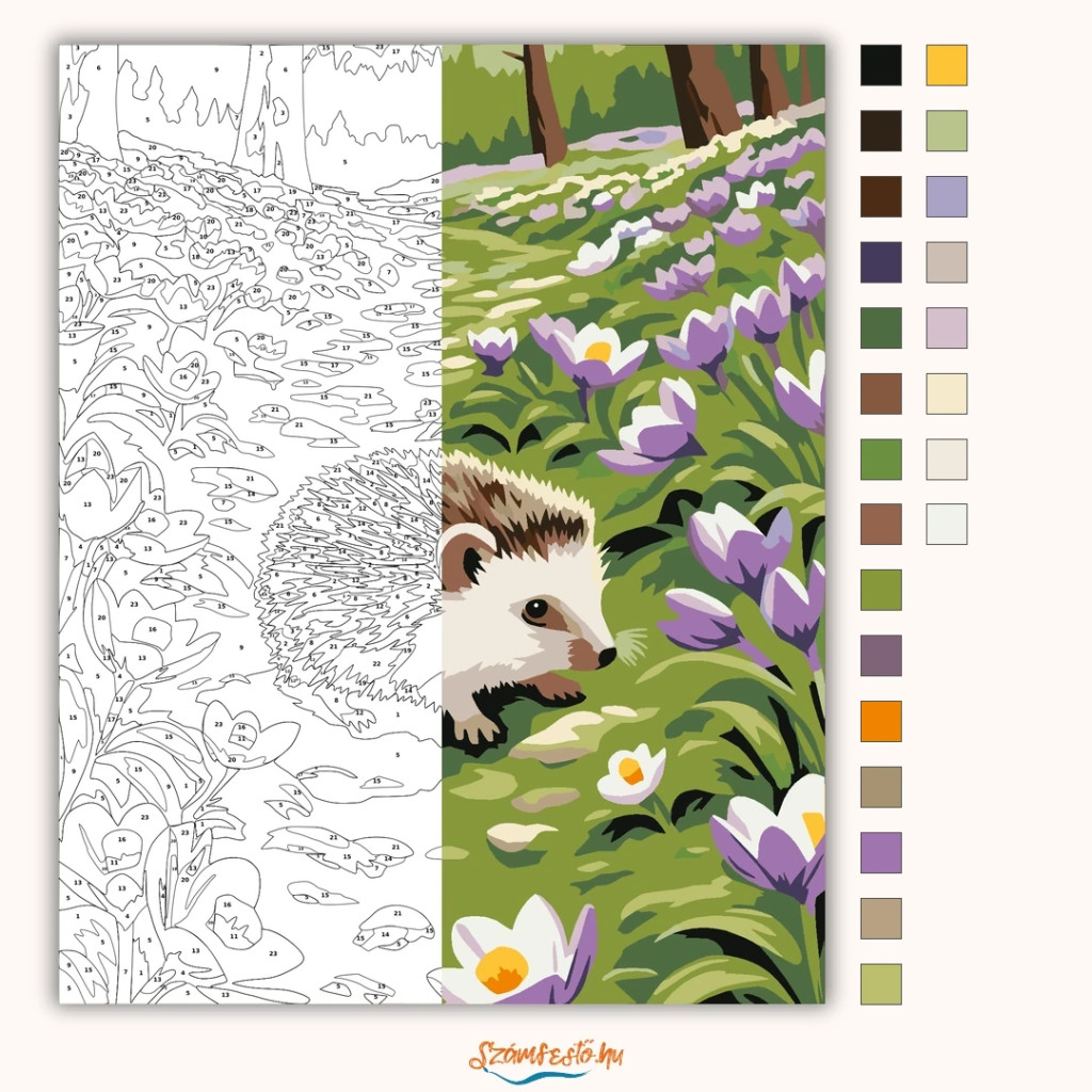 A képen egy sün sétál lassan egy mohás erdei ösvényen, amelyet krókuszok és hóvirágok szegélyeznek. A friss tavaszi virágok és a zöld növényzet nyugodt, kedves hangulatot adnak. A háttérben fák és egy kanyargó ösvény vezeti tovább a tekintetet. Ez a számfestő készlet tökéletes választás, ha egyedi dekorációval tennéd szebbé otthonodat, vagy ha különleges ajándékot keresel. A csomagban minden megtalálható, amire a festéshez szükséged van.