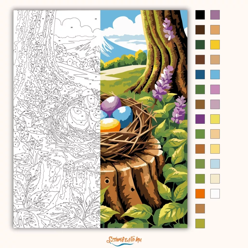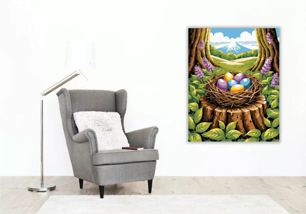 A képen egy fészek látható egy fatönkön, benne élénk színű tojásokkal, erdei levelek és lila virágok között. A háttérben zöld dombok és egy hófödte hegy rajzolódik ki a felhős ég alatt. Friss, tavaszias hangulatú jelenet, vidám, tiszta színekkel. Engedd szabadjára a kreativitásodat, és alkoss egy különleges műalkotást, amely otthonod dísze lehet de egyedi ajándékként is kiváló. A számfestő készletben minden szükséges eszközt megtalálsz a tökéletes végeredményhez.