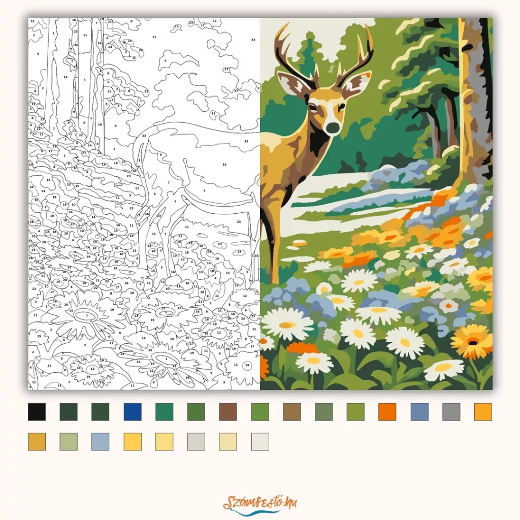 A képen egy agancsos szarvas áll egy tavaszi erdei tisztás szélén, körülötte sűrű, virágokkal teli rét. Az élénk zöld háttér és a sok fehér, sárga és narancs virág friss, természetközeli hangulatot ad. Nyugodt, derűs látvány, ami jól mutat otthon vagy ajándékként is. Legyen a lakásod dísze vagy egy kedves meglepetés valaki számára – ez a számfestő készlet tökéletes választás mindkettőre. A készletben mindent megtalálsz, amivel lépésről lépésre megalkotható ez a gyönyörű festmény.