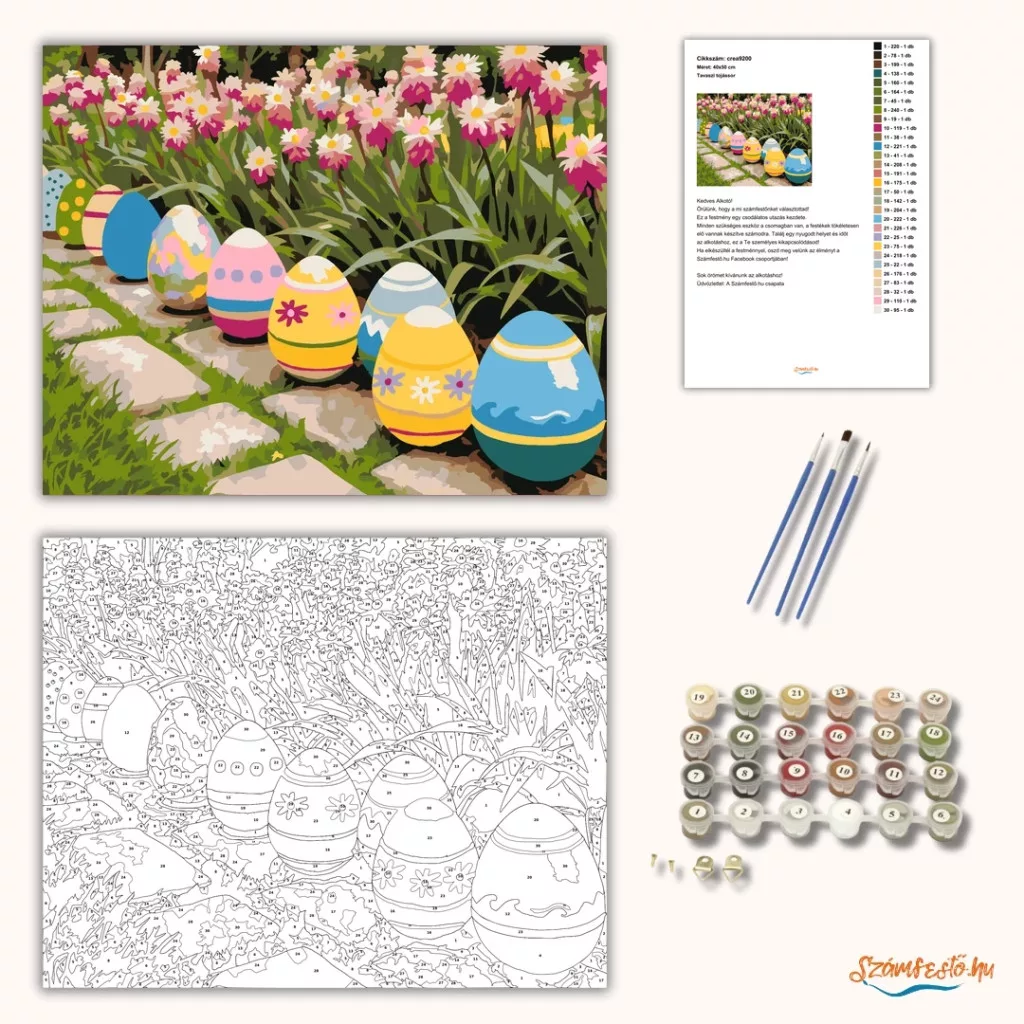A képen egy kerti ösvény mentén sorakozó, pasztell mintás húsvéti tojások láthatók. A háttérben sok virág és dús zöld levelek adják a tavaszi, vidám hangulatot. A tojásokon csíkok, pöttyök és virágminták teszik játékossá a látványt. Legyen a lakásod dísze vagy egy kedves meglepetés valaki számára – ez a számfestő készlet tökéletes választás mindkettőre. A készletben mindent megtalálsz, amivel lépésről lépésre megalkotható ez a gyönyörű festmény.