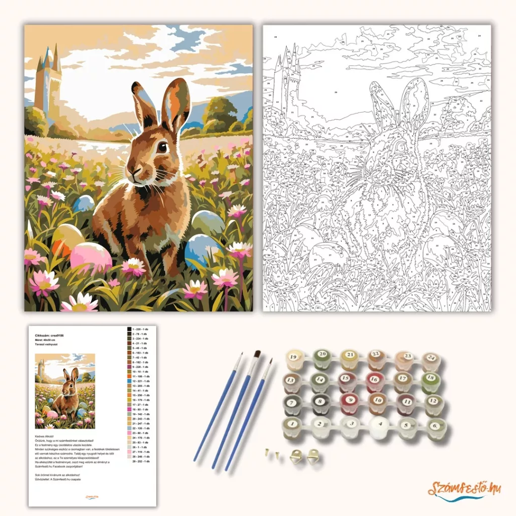 A képen egy vadnyúl ül egy virágos réten, körülötte színes tojásokkal. A háttérben egy folyó, dombok és egy távoli templomtorony látható a felhős ég alatt. Meleg, tavaszias hangulatú jelenet, barátságos, természetközeli színekkel. Legyen a lakásod dísze vagy egy kedves meglepetés valaki számára – ez a számfestő készlet tökéletes választás mindkettőre. A készletben mindent megtalálsz, amivel lépésről lépésre megalkotható ez a gyönyörű festmény.