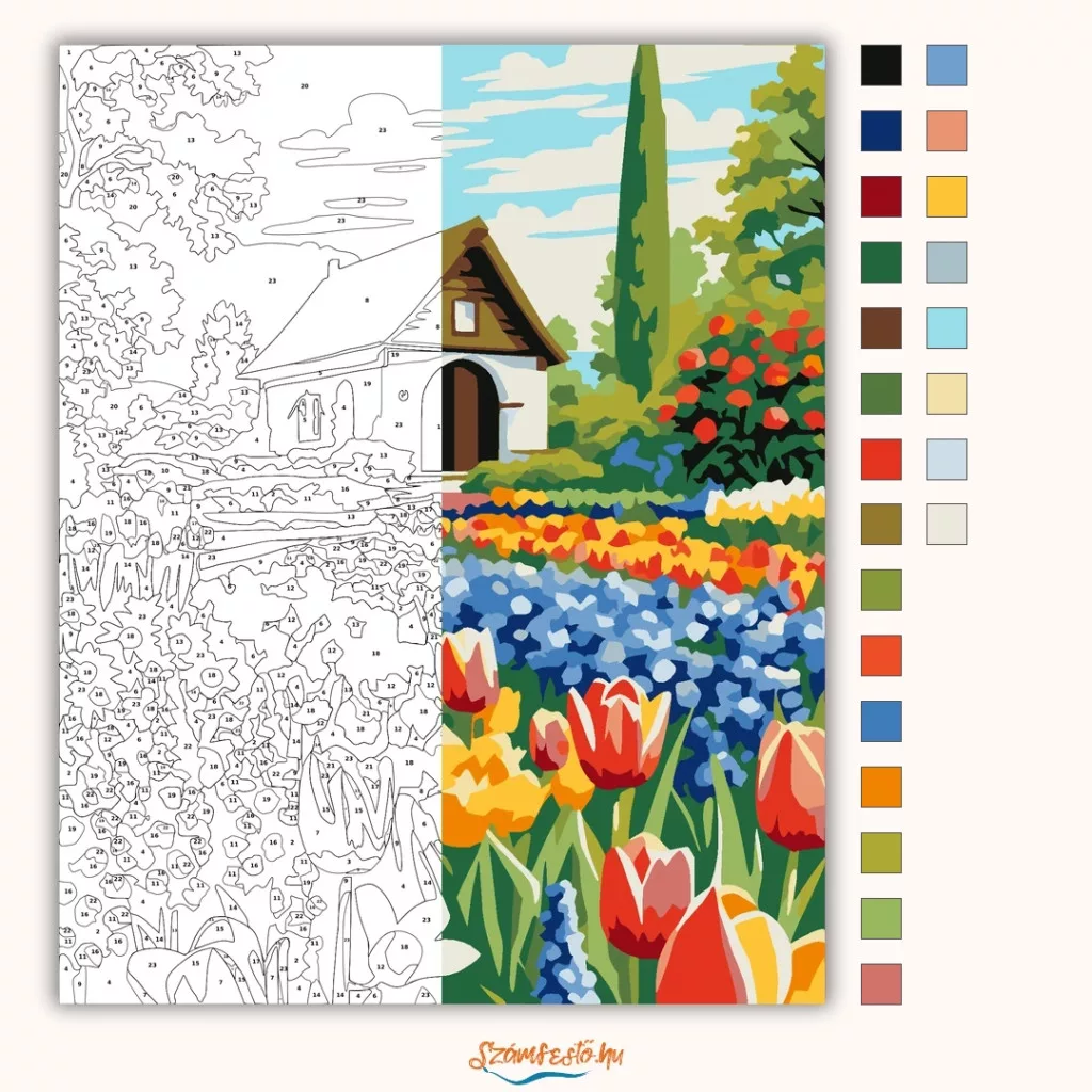 A képen egy kis házikó látható egy tavaszi kert közepén, kanyargó ösvénnyel a bejárat felé. A kertet tulipánok, jácintok és nárciszok töltik meg, élénk, friss színekkel. A zöld fák és a felhős kék ég nyugodt, derűs hangulatot adnak a látványnak. Díszítsd otthonodat saját kézzel készített műalkotással, vagy ajándékozd meg szeretteidet egy igazán különleges élménnyel! A számfestő készletben minden szükséges eszköz megtalálható a festmény elkészítéséhez.