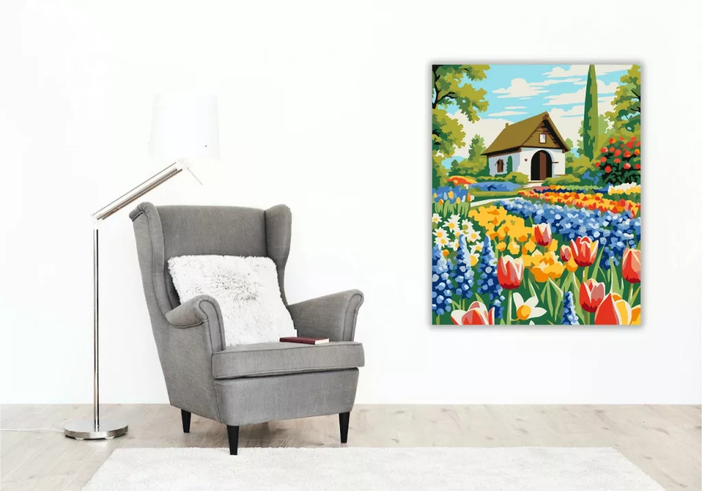 A képen egy kis házikó látható egy tavaszi kert közepén, kanyargó ösvénnyel a bejárat felé. A kertet tulipánok, jácintok és nárciszok töltik meg, élénk, friss színekkel. A zöld fák és a felhős kék ég nyugodt, derűs hangulatot adnak a látványnak. Engedd szabadjára a kreativitásodat, és alkoss egy különleges műalkotást, amely otthonod dísze lehet de egyedi ajándékként is kiváló. A számfestő készletben minden szükséges eszközt megtalálsz a tökéletes végeredményhez.