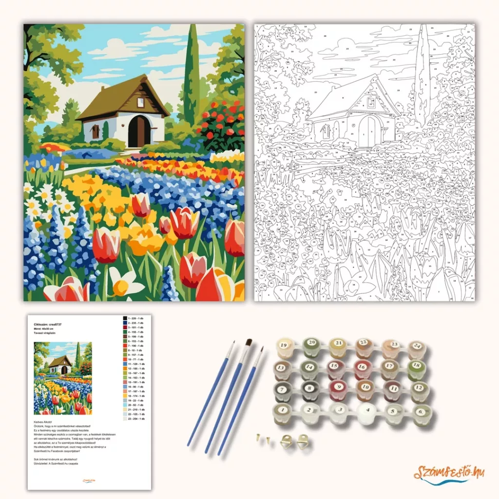 A képen egy kis házikó látható egy tavaszi kert közepén, kanyargó ösvénnyel a bejárat felé. A kertet tulipánok, jácintok és nárciszok töltik meg, élénk, friss színekkel. A zöld fák és a felhős kék ég nyugodt, derűs hangulatot adnak a látványnak. Díszítsd otthonodat saját kézzel készített műalkotással, vagy ajándékozd meg szeretteidet egy igazán különleges élménnyel! A számfestő készletben minden szükséges eszköz megtalálható a festmény elkészítéséhez.