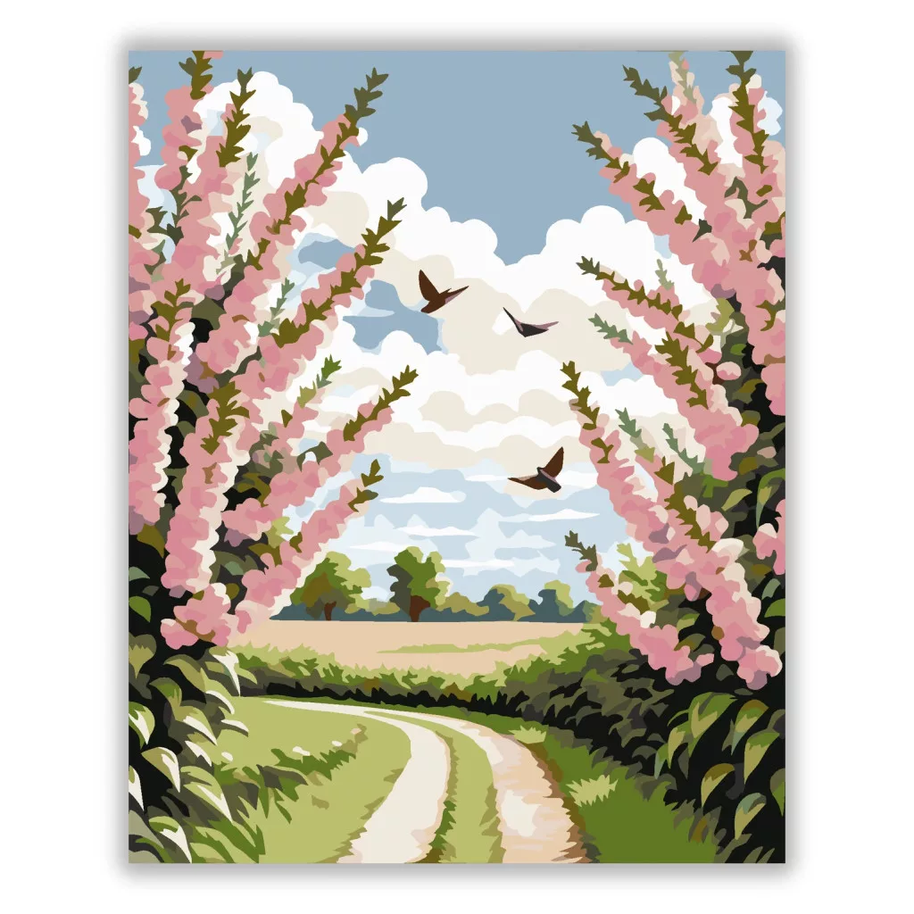 A képen egy kanyargó vidéki ösvény látható, amelyet két oldalt magas, rózsaszín és fehér virágzó sövények szegélyeznek. A távolban zöld fák és nyugodt mezők nyílnak meg, felettük felhős égbolt. A levegőben néhány madár repül, ettől a jelenet könnyed és tavaszias hangulatú. Varázsolj egyedi hangulatot otthonodba ezzel a gyönyörű számfestő készlettel, amely tökéletes ajándék is lehet szeretteid számára. A csomag mindent tartalmaz, amire szükséged van ahhoz, hogy saját kezűleg alkoss egy lenyűgöző festményt.