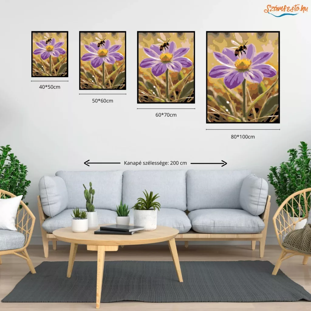 A képen egy méh lebeg egy lila, sárga közepű tavaszi virág felett, mintha épp leszállni készülne. A meleg, napfényes háttér és a finom növényi részletek nyugodt, természetközeli hangulatot adnak. Ideális választás, ha egy kedves, tavaszi témájú képet szeretnél a falra. Ez a számfestő készlet tökéletes választás, ha egyedi dekorációval tennéd szebbé otthonodat, vagy ha különleges ajándékot keresel. A csomagban minden megtalálható, amire a festéshez szükséged van.