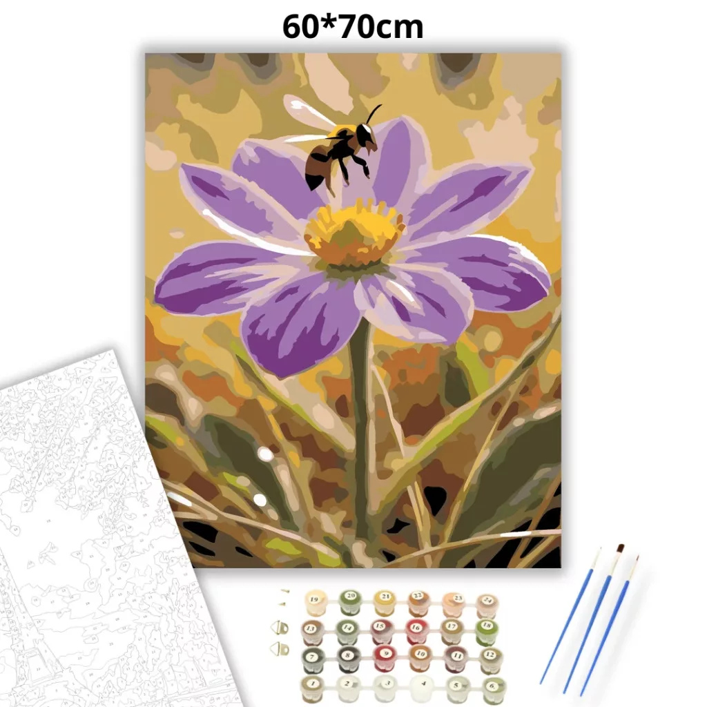 A képen egy méh lebeg egy lila, sárga közepű tavaszi virág felett, mintha épp leszállni készülne. A meleg, napfényes háttér és a finom növényi részletek nyugodt, természetközeli hangulatot adnak. Ideális választás, ha egy kedves, tavaszi témájú képet szeretnél a falra. Díszítsd otthonodat saját kézzel készített műalkotással, vagy ajándékozd meg szeretteidet egy igazán különleges élménnyel! A számfestő készletben minden szükséges eszköz megtalálható a festmény elkészítéséhez.