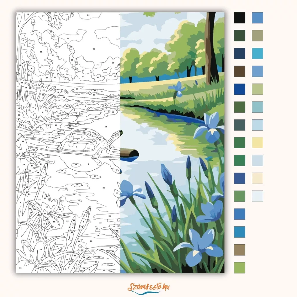 A képen egy erdei tópart látható, ahol egy teknős pihen egy félig vízbe merült farönkön. A nyugodt víztükörben visszaverődnek a fák és az ég, a partot pedig virágok és fűszálak szegélyezik. Friss, tavaszi hangulatú jelenet, sok zölddel és lágy kék tónusokkal. Legyen a lakásod dísze vagy egy kedves meglepetés valaki számára – ez a számfestő készlet tökéletes választás mindkettőre. A készletben mindent megtalálsz, amivel lépésről lépésre megalkotható ez a gyönyörű festmény.