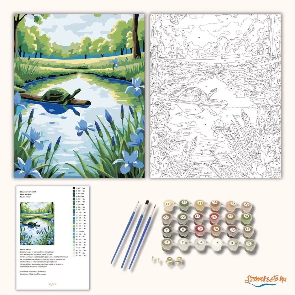 A képen egy erdei tópart látható, ahol egy teknős pihen egy félig vízbe merült farönkön. A nyugodt víztükörben visszaverődnek a fák és az ég, a partot pedig virágok és fűszálak szegélyezik. Friss, tavaszi hangulatú jelenet, sok zölddel és lágy kék tónusokkal. Díszítsd otthonodat saját kézzel készített műalkotással, vagy ajándékozd meg szeretteidet egy igazán különleges élménnyel! A számfestő készletben minden szükséges eszköz megtalálható a festmény elkészítéséhez.