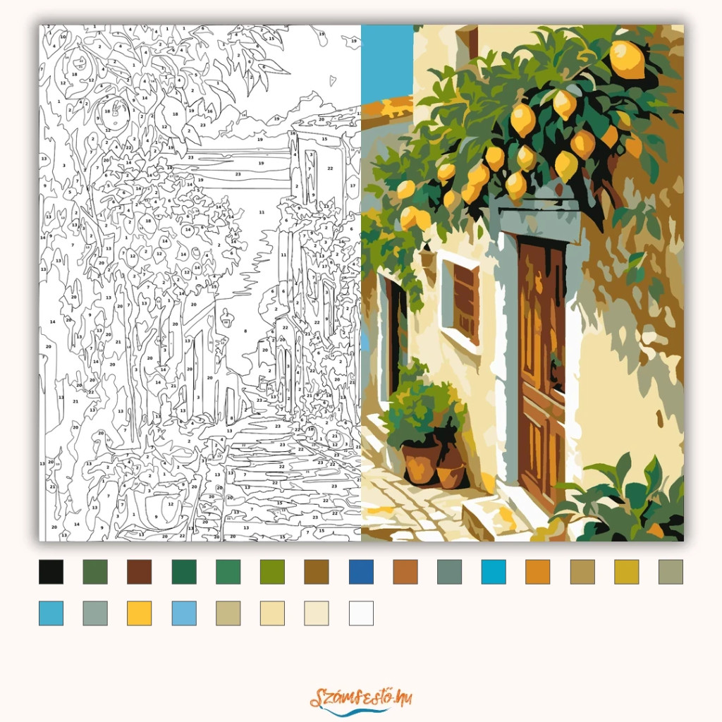 A képen egy szűk, napfényes utca látható fehér házakkal és kőburkolatú sétánnyal, amely a tenger felé vezet. A falak mellett cserepes növények és zöld futónövények vannak, felül pedig citromfák hajlanak az utca fölé. A távolban kék víz és felhők teszik nyugodttá és üdévé a látványt. Díszítsd otthonodat saját kézzel készített műalkotással, vagy ajándékozd meg szeretteidet egy igazán különleges élménnyel! A számfestő készletben minden szükséges eszköz megtalálható a festmény elkészítéséhez.