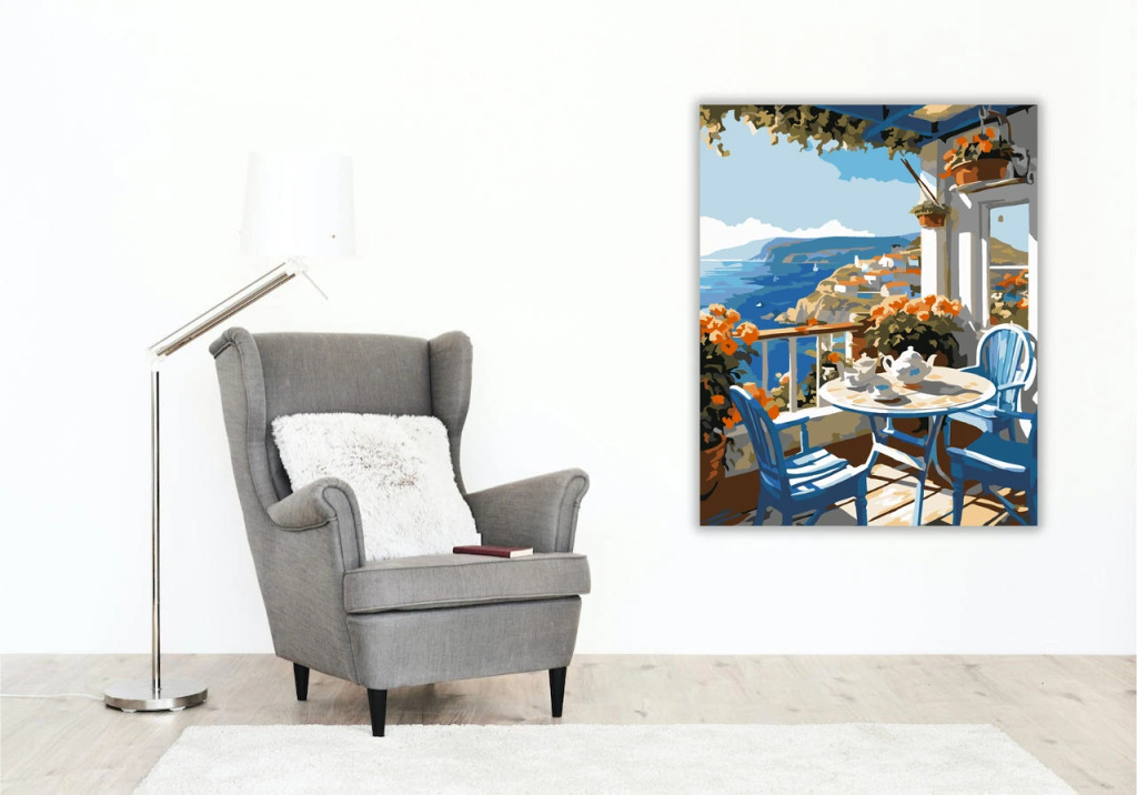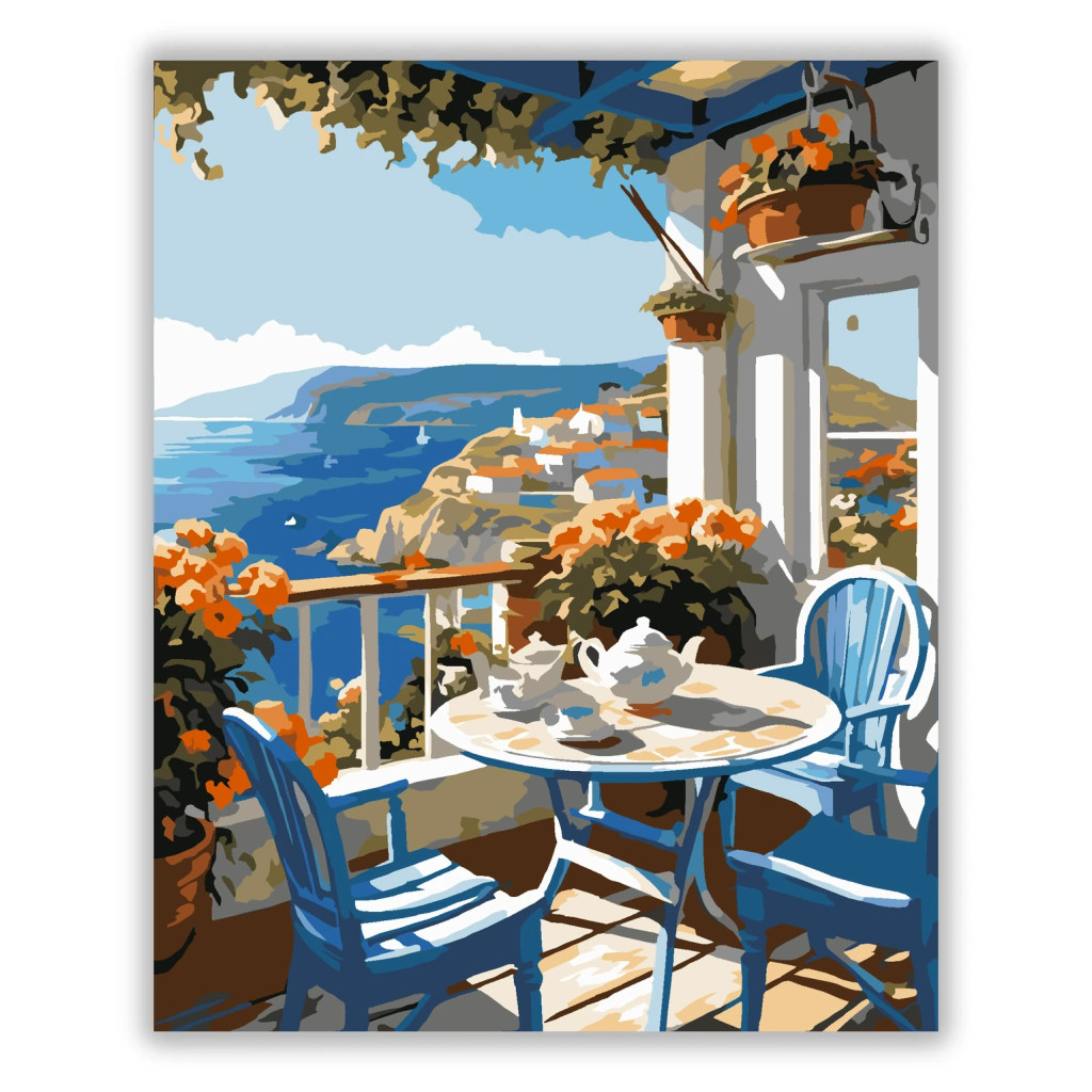 A képen egy virágokkal teli terasz látható, kerek asztallal és két székkel. Az asztalon teáskanna és csészék vannak, a háttérben pedig a tenger és a sziklás part mentén elterülő házak. A látvány világos, napfényes és nyugodt hangulatot áraszt. Ez a számfestő készlet tökéletes választás, ha egyedi dekorációval tennéd szebbé otthonodat, vagy ha különleges ajándékot keresel. A csomagban minden megtalálható, amire a festéshez szükséged van.