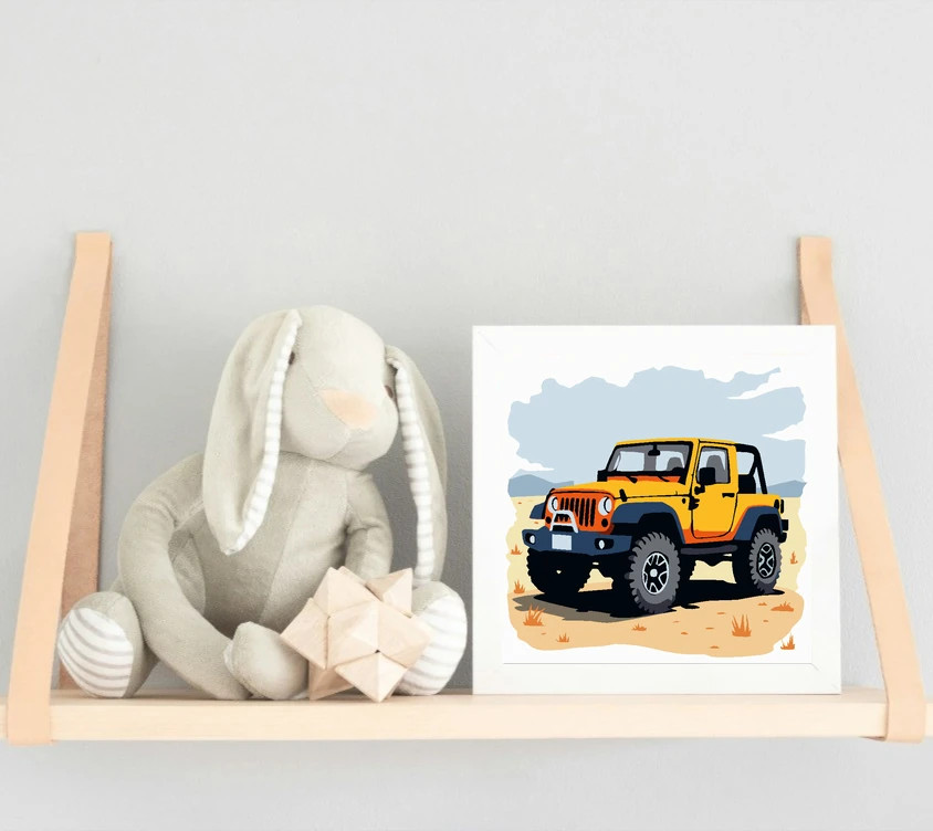 Terepjáró a homokban - gyerek számfestő készlet - Számfestő.hu - 20×20cm - Keretre feszítve