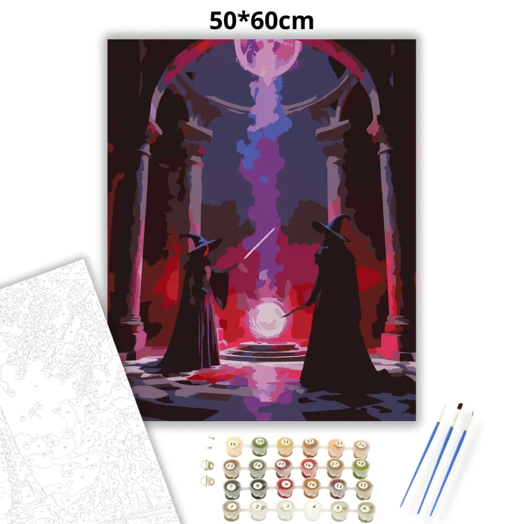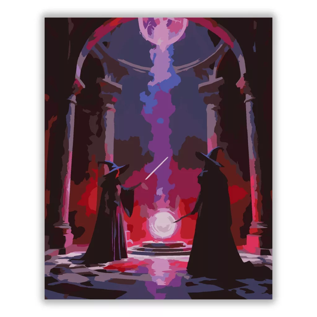 A képen két köpenyes varázsló áll egymással szemben egy hatalmas, boltíves teremben, miközben varázslataik egy izzó energiagömbben találkoznak. A levegőben felfelé áramló vörös és lila mágikus erő, valamint a magas oszlopok és sötét árnyékok drámai, feszültséggel teli hangulatot teremtenek. Díszítsd otthonodat saját kézzel készített műalkotással, vagy ajándékozd meg szeretteidet egy igazán különleges élménnyel! A számfestő készletben minden szükséges eszköz megtalálható a festmény elkészítéséhez.