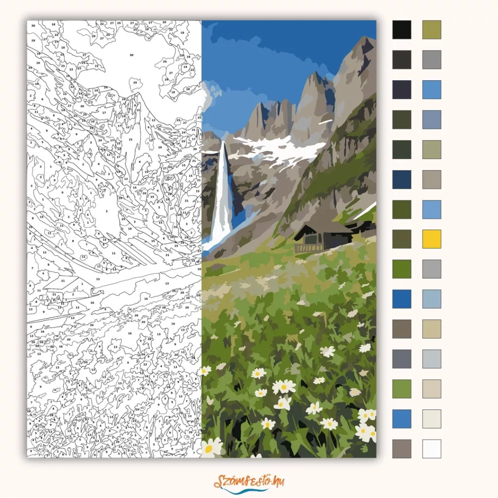 A képen egy széles hegyi völgy látható, háttérben havas csúcsokkal és egy magas vízeséssel, amely a sziklák közül zúdul alá. Elöl zöld hegyi rét terül el fehér vadvirágokkal, a domboldalban pedig néhány faház bújik meg. A látvány friss, tiszta és nyugodt hangulatot áraszt, sok égkék, szürke és zöld árnyalattal. Varázsolj egyedi hangulatot otthonodba ezzel a gyönyörű számfestő készlettel, amely tökéletes ajándék is lehet szeretteid számára. A csomag mindent tartalmaz, amire szükséged van ahhoz, hogy saját kezűleg alkoss egy lenyűgöző festményt.