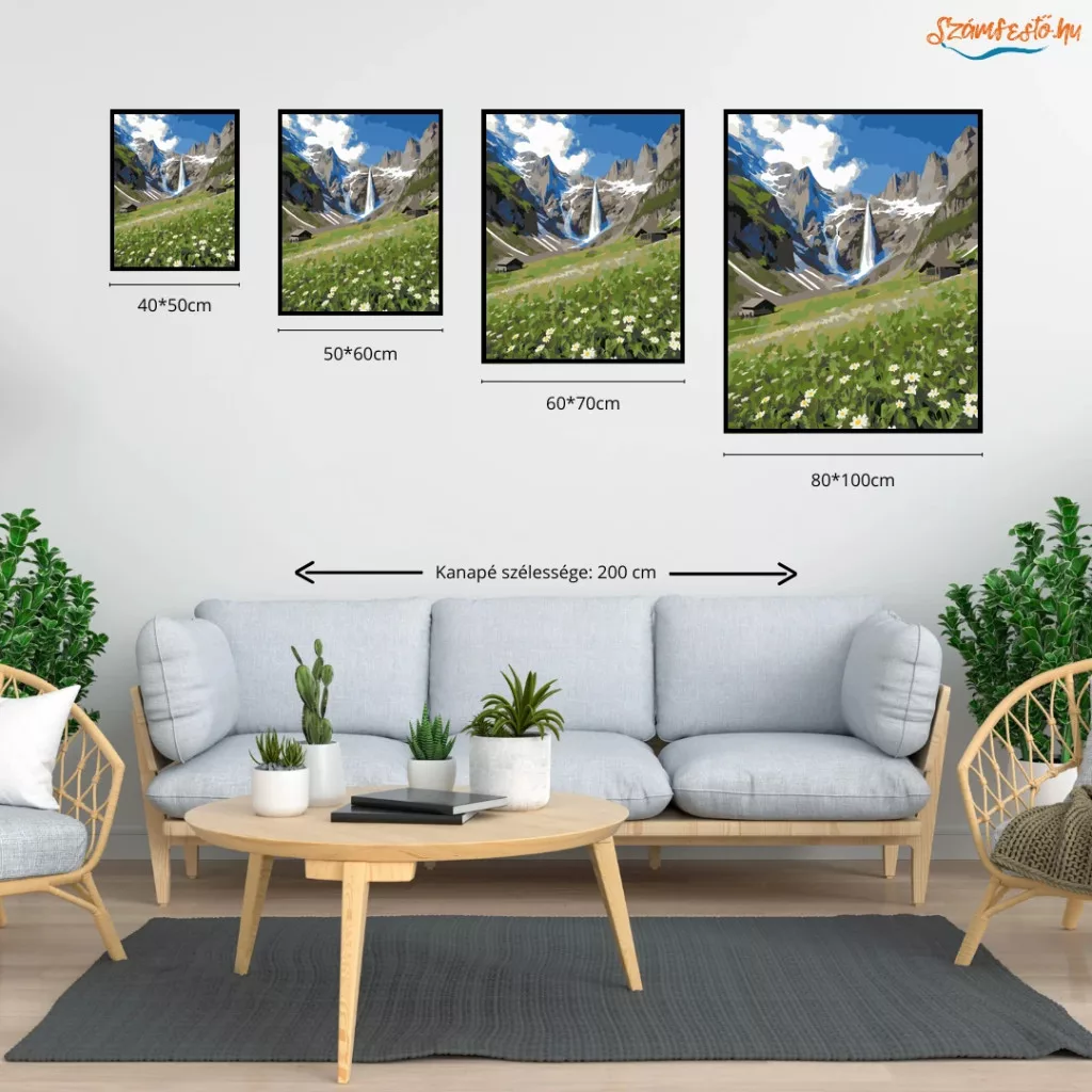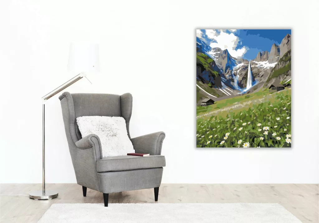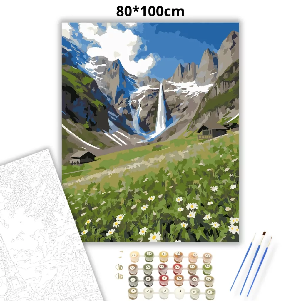 A képen egy széles hegyi völgy látható, háttérben havas csúcsokkal és egy magas vízeséssel, amely a sziklák közül zúdul alá. Elöl zöld hegyi rét terül el fehér vadvirágokkal, a domboldalban pedig néhány faház bújik meg. A látvány friss, tiszta és nyugodt hangulatot áraszt, sok égkék, szürke és zöld árnyalattal. Legyen a lakásod dísze vagy egy kedves meglepetés valaki számára – ez a számfestő készlet tökéletes választás mindkettőre. A készletben mindent megtalálsz, amivel lépésről lépésre megalkotható ez a gyönyörű festmény.