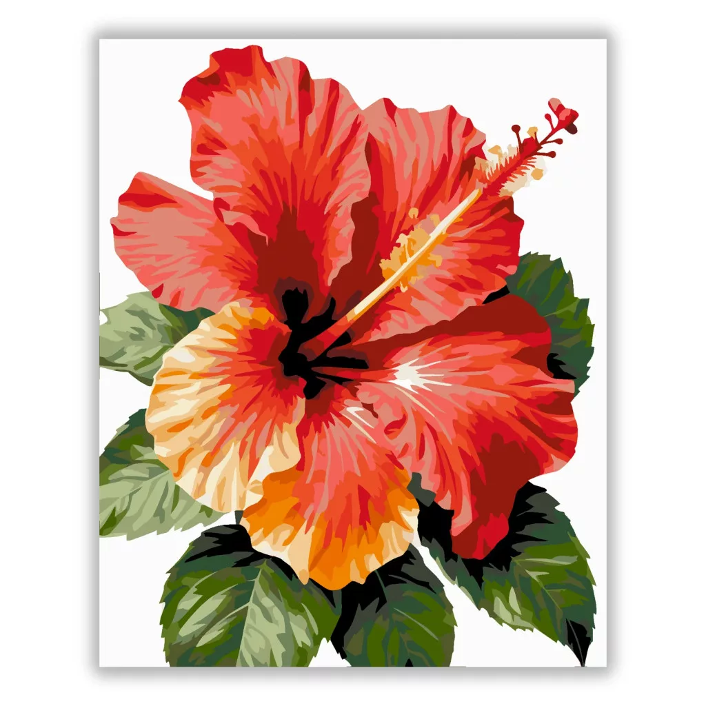 A képen egy nagy, élénk hibiszkusz virág látható, a közepén sárgás porzóval. A piros és narancs árnyalatú szirmok mellett több zöld levél keretezi a virágot. A fehér háttér kiemeli a friss, trópusi hangulatot. Díszítsd otthonodat saját kézzel készített műalkotással, vagy ajándékozd meg szeretteidet egy igazán különleges élménnyel! A számfestő készletben minden szükséges eszköz megtalálható a festmény elkészítéséhez.