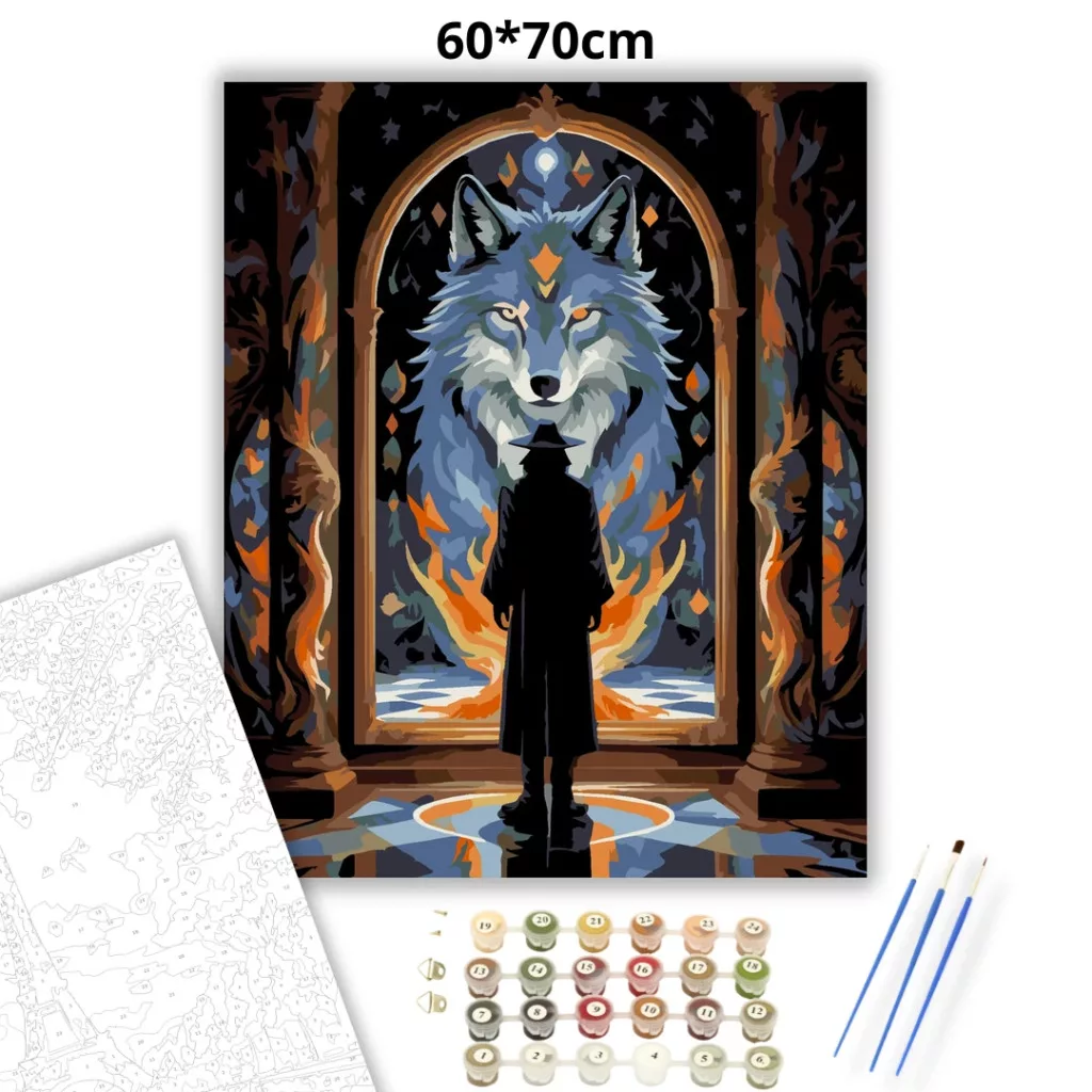 A képen egy köpenyes alak áll egy tükrös, íves keretű térben, ahol a tükörben egy hatalmas farkas arca jelenik meg. A sötét háttérben csillagszerű formák és lebegő díszek láthatók, a jelenetet meleg fények teszik sejtelmessé. Titokzatos, mágikus hangulatú kép, erős kontrasztokkal és drámai fényekkel. Engedd szabadjára a kreativitásodat, és alkoss egy különleges műalkotást, amely otthonod dísze lehet de egyedi ajándékként is kiváló. A számfestő készletben minden szükséges eszközt megtalálsz a tökéletes végeredményhez.