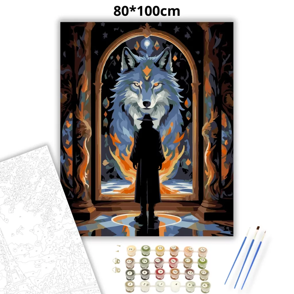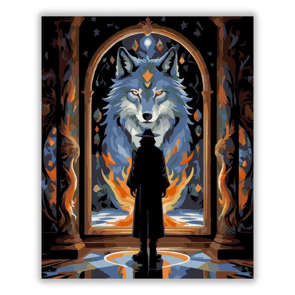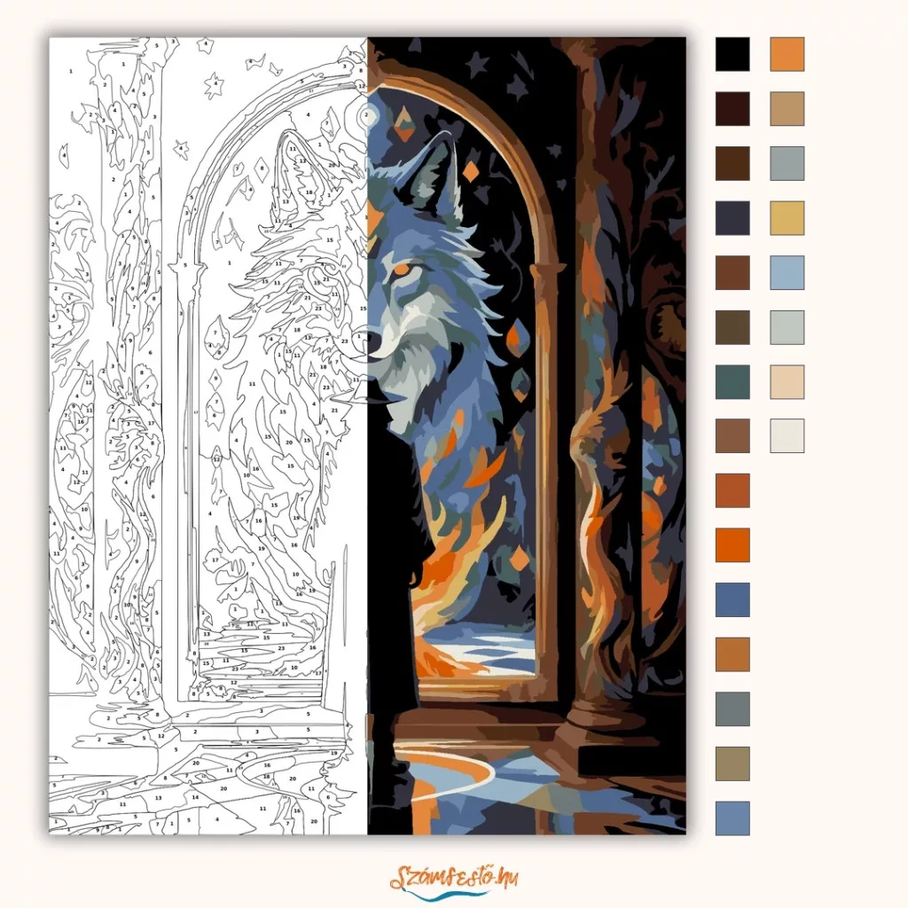 A képen egy köpenyes alak áll egy tükrös, íves keretű térben, ahol a tükörben egy hatalmas farkas arca jelenik meg. A sötét háttérben csillagszerű formák és lebegő díszek láthatók, a jelenetet meleg fények teszik sejtelmessé. Titokzatos, mágikus hangulatú kép, erős kontrasztokkal és drámai fényekkel. Engedd szabadjára a kreativitásodat, és alkoss egy különleges műalkotást, amely otthonod dísze lehet de egyedi ajándékként is kiváló. A számfestő készletben minden szükséges eszközt megtalálsz a tökéletes végeredményhez.