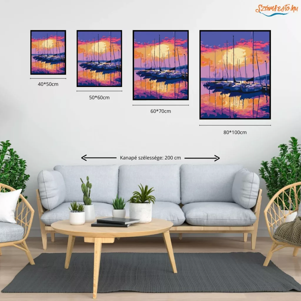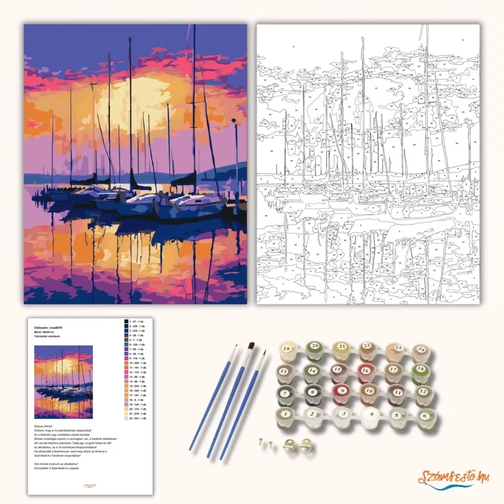 A képen kikötőben álló vitorlások láthatók, magas árbócokkal a nyugodt víz mellett. A háttérben a nap alacsonyan áll, és a felhős ég erős, meleg fényekben ragyog. A víztükörben látványos tükröződések jelennek meg, ami csendes, esti hangulatot ad a képnek. Legyen a lakásod dísze vagy egy kedves meglepetés valaki számára – ez a számfestő készlet tökéletes választás mindkettőre. A készletben mindent megtalálsz, amivel lépésről lépésre megalkotható ez a gyönyörű festmény.