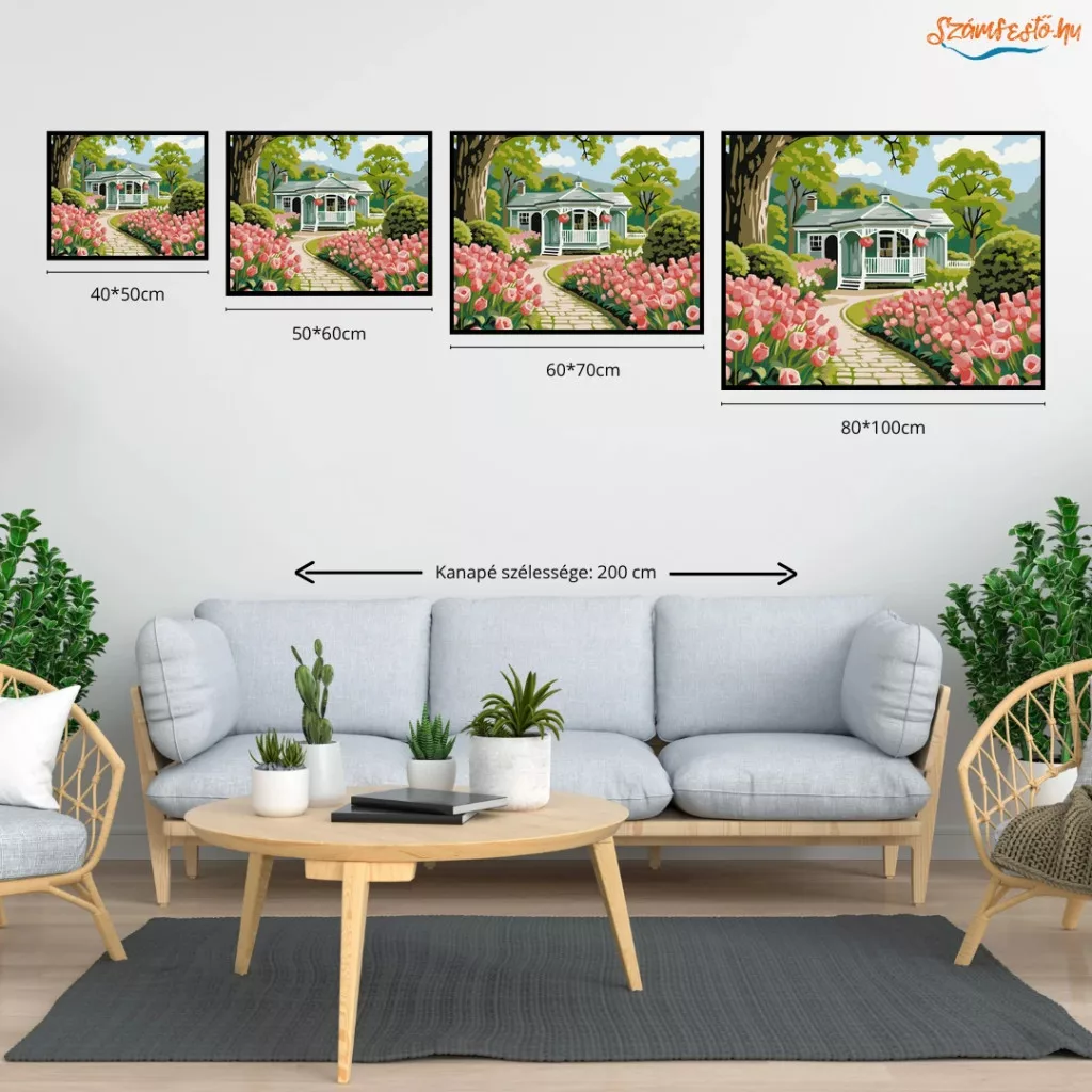 t, kanyargó kőösvénnyel a bejáratig. Az előtérben rengeteg rózsaszín tulipán virágzik, körülötte sűrű, zöld bokrok és nagy fák. A világos ég és a friss tavaszi hangulat nyugodt, otthonos érzetet ad. Díszítsd otthonodat saját kézzel készített műalkotással, vagy ajándékozd meg szeretteidet egy igazán különleges élménnyel! A számfestő készletben minden szükséges eszköz megtalálható a festmény elkészítéséhez.