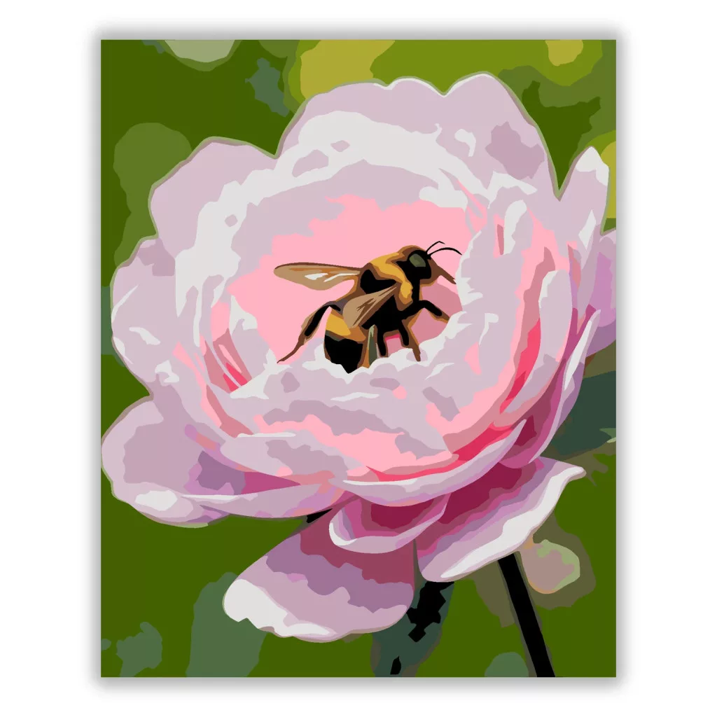 A képen egy poszméh pihen egy halvány rózsaszín bazsarózsa közepén, enyhén nyitott szárnyakkal. A puha, világos szirmok és a mélyebb rózsaszín árnyalatok friss, tavaszi hangulatot adnak. A zöld háttér szépen kiemeli a virágot és a rovar apró részleteit. Varázsolj egyedi hangulatot otthonodba ezzel a gyönyörű számfestő készlettel, amely tökéletes ajándék is lehet szeretteid számára. A csomag mindent tartalmaz, amire szükséged van ahhoz, hogy saját kezűleg alkoss egy lenyűgöző festményt.