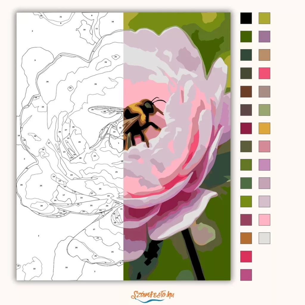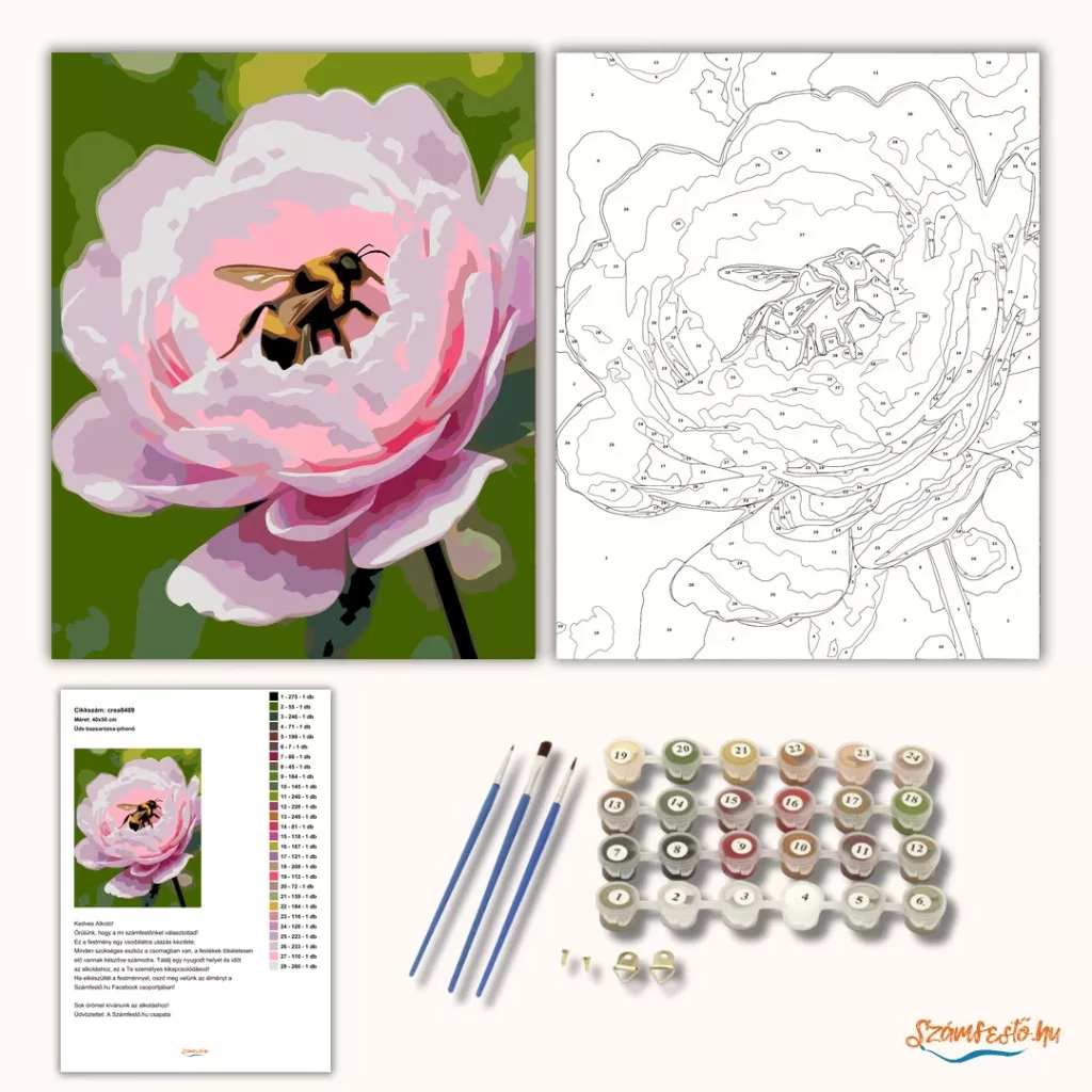 A képen egy poszméh pihen egy halvány rózsaszín bazsarózsa közepén, enyhén nyitott szárnyakkal. A puha, világos szirmok és a mélyebb rózsaszín árnyalatok friss, tavaszi hangulatot adnak. A zöld háttér szépen kiemeli a virágot és a rovar apró részleteit. Ez a számfestő készlet tökéletes választás, ha egyedi dekorációval tennéd szebbé otthonodat, vagy ha különleges ajándékot keresel. A csomagban minden megtalálható, amire a festéshez szükséged van.