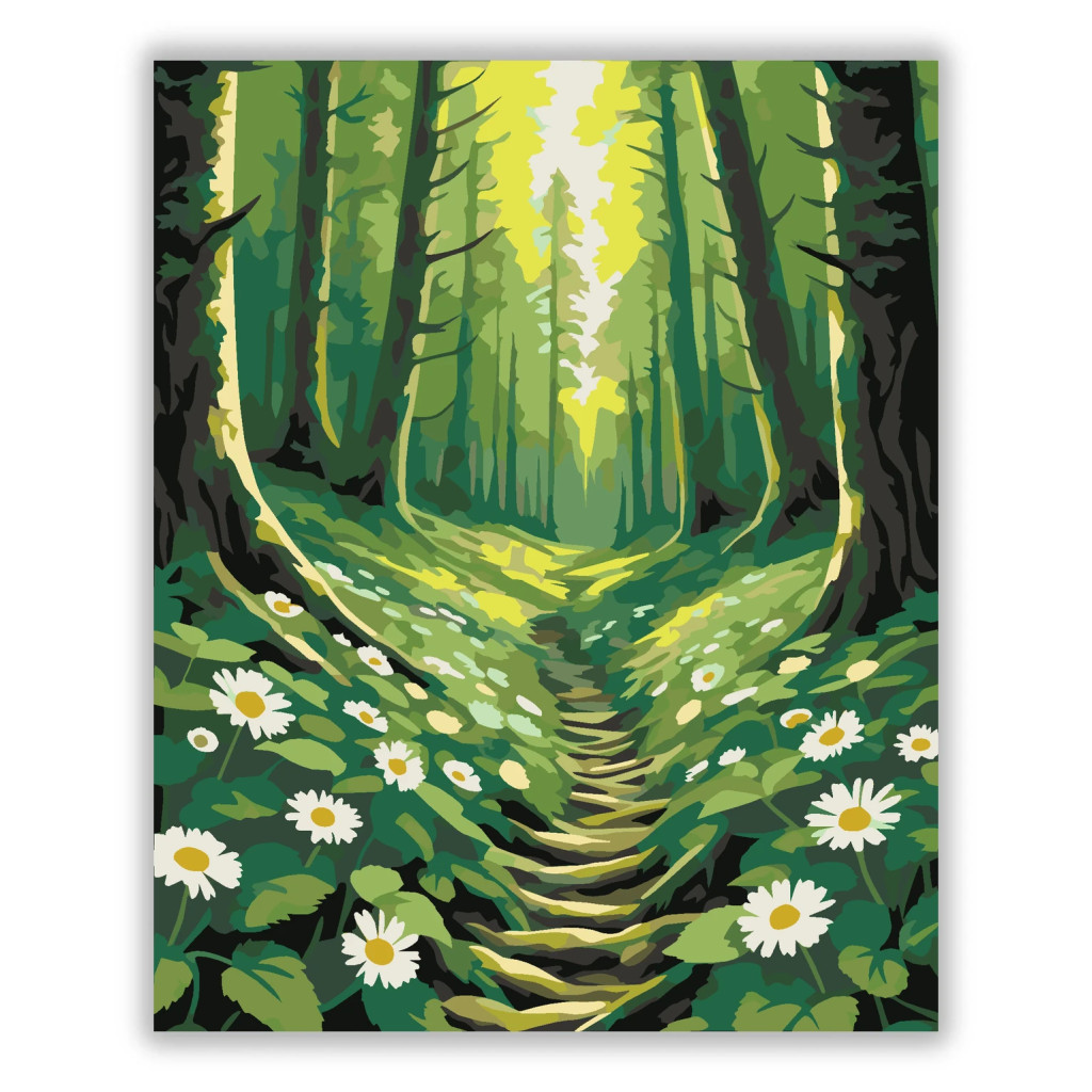 A képen egy keskeny erdei ösvény látható, amely a magas fák között a sűrű aljnövényzetbe vezet. Az út szélén fehér vadvirágok nyílnak, a lombkoronán pedig átszűrődik a napfény. Friss, tavaszi hangulatú jelenet, sok zöld árnyalattal és világos fényfoltokkal. Engedd szabadjára a kreativitásodat, és alkoss egy különleges műalkotást, amely otthonod dísze lehet de egyedi ajándékként is kiváló. A számfestő készletben minden szükséges eszközt megtalálsz a tökéletes végeredményhez.