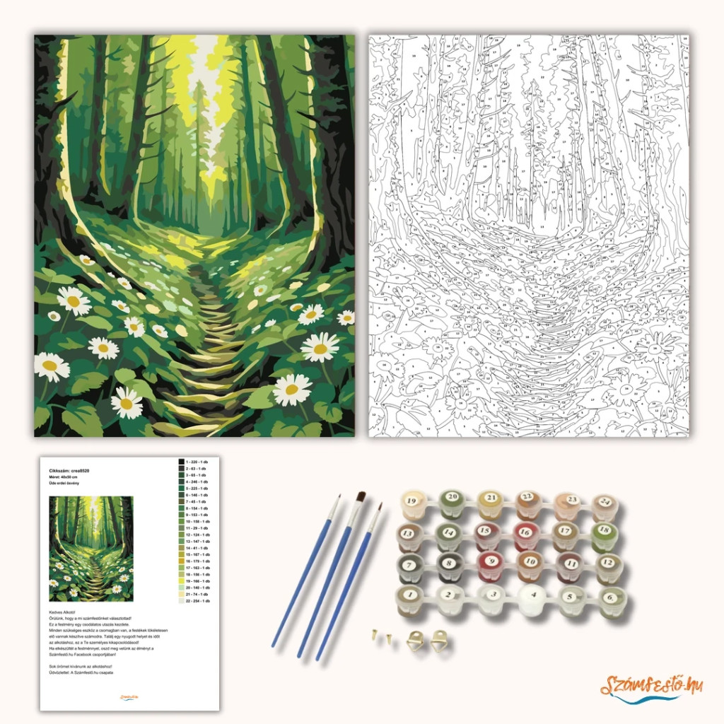 A képen egy keskeny erdei ösvény látható, amely a magas fák között a sűrű aljnövényzetbe vezet. Az út szélén fehér vadvirágok nyílnak, a lombkoronán pedig átszűrődik a napfény. Friss, tavaszi hangulatú jelenet, sok zöld árnyalattal és világos fényfoltokkal. Ez a számfestő készlet tökéletes választás, ha egyedi dekorációval tennéd szebbé otthonodat, vagy ha különleges ajándékot keresel. A csomagban minden megtalálható, amire a festéshez szükséged van.