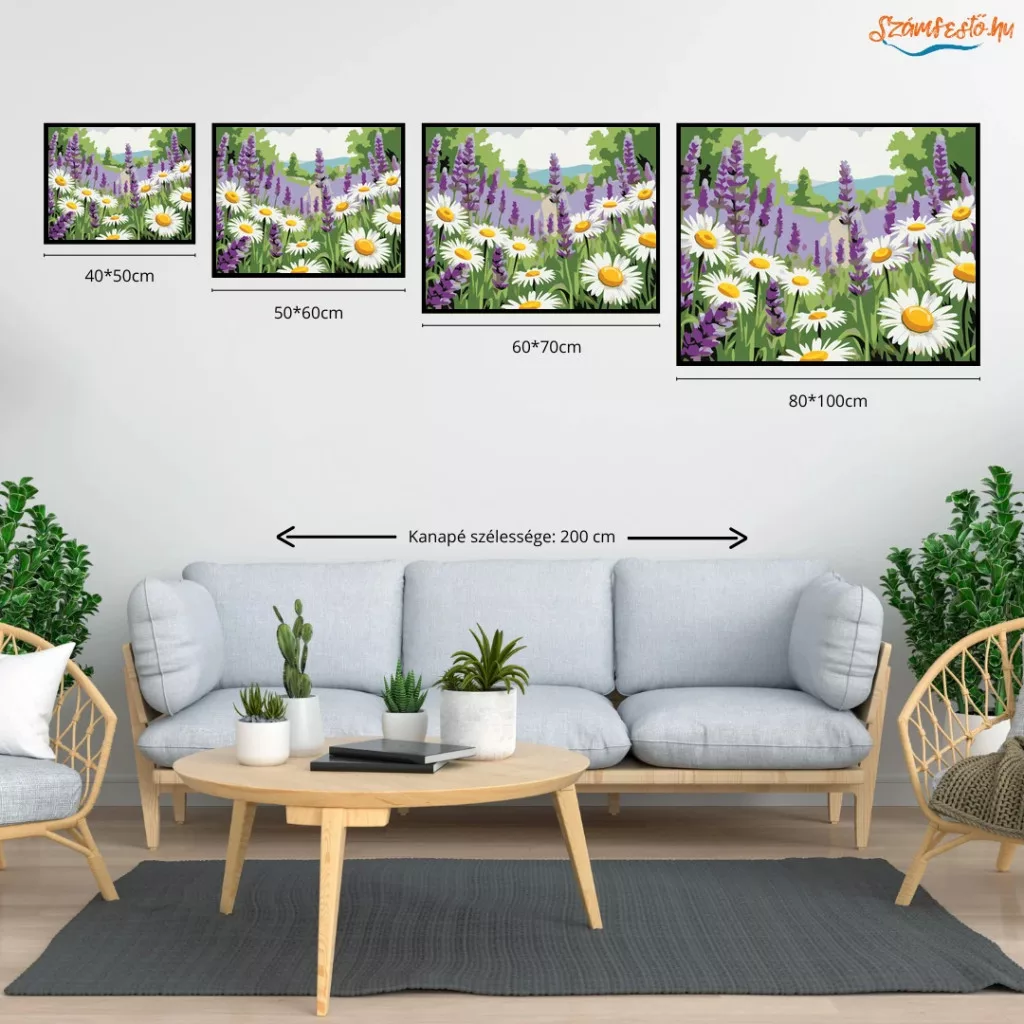 A képen tavaszi mező látható, ahol levendula és margaréták nyílnak a napsütésben. A virágok között egy keskeny ösvény vezet a távolba, dombok és fák felé. Friss, üde hangulatú látvány, sok zölddel, fehérrel és lila árnyalatokkal. Ez a számfestő készlet tökéletes választás, ha egyedi dekorációval tennéd szebbé otthonodat, vagy ha különleges ajándékot keresel. A csomagban minden megtalálható, amire a festéshez szükséged van.
