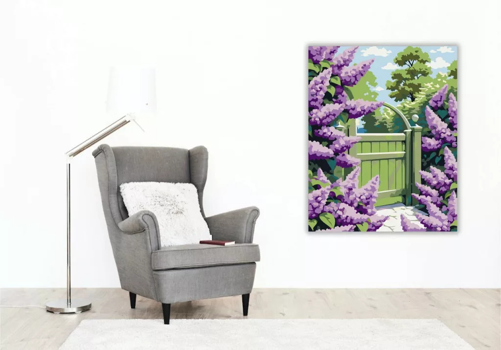 A képen egy zöld kerti kapu látható, amelyet mindkét oldalon sűrű, virágzó orgonabokrok vesznek körül. A háttérben lombos fák és felhős égbolt adnak friss, tavaszi hangulatot. A kapu előtt világos kerti ösvény vezet befelé a kertbe. Díszítsd otthonodat saját kézzel készített műalkotással, vagy ajándékozd meg szeretteidet egy igazán különleges élménnyel! A számfestő készletben minden szükséges eszköz megtalálható a festmény elkészítéséhez.