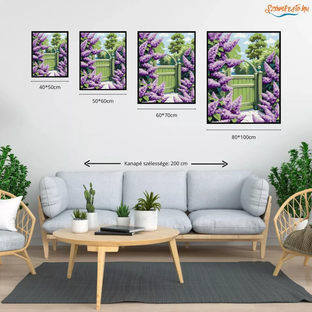 A képen egy zöld kerti kapu látható, amelyet mindkét oldalon sűrű, virágzó orgonabokrok vesznek körül. A háttérben lombos fák és felhős égbolt adnak friss, tavaszi hangulatot. A kapu előtt világos kerti ösvény vezet befelé a kertbe. Díszítsd otthonodat saját kézzel készített műalkotással, vagy ajándékozd meg szeretteidet egy igazán különleges élménnyel! A számfestő készletben minden szükséges eszköz megtalálható a festmény elkészítéséhez.