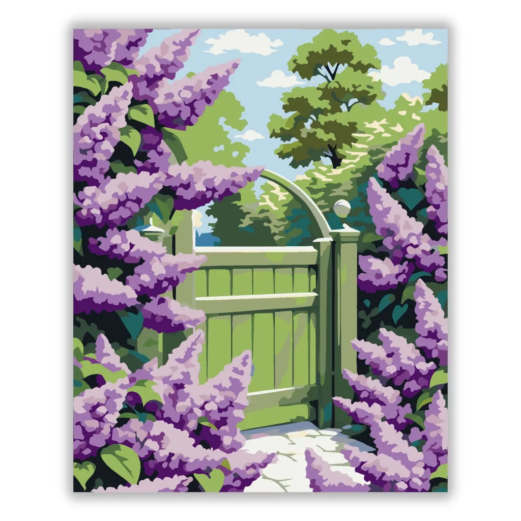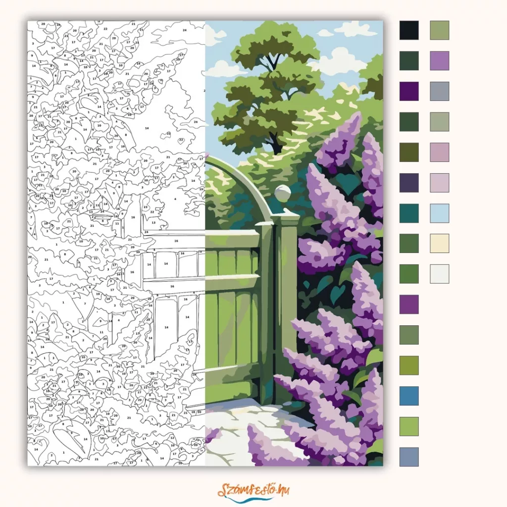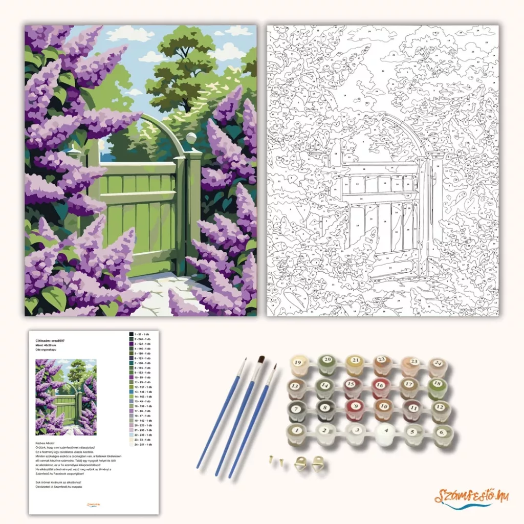 A képen egy zöld kerti kapu látható, amelyet mindkét oldalon sűrű, virágzó orgonabokrok vesznek körül. A háttérben lombos fák és felhős égbolt adnak friss, tavaszi hangulatot. A kapu előtt világos kerti ösvény vezet befelé a kertbe. Varázsolj egyedi hangulatot otthonodba ezzel a gyönyörű számfestő készlettel, amely tökéletes ajándék is lehet szeretteid számára. A csomag mindent tartalmaz, amire szükséged van ahhoz, hogy saját kezűleg alkoss egy lenyűgöző festményt.