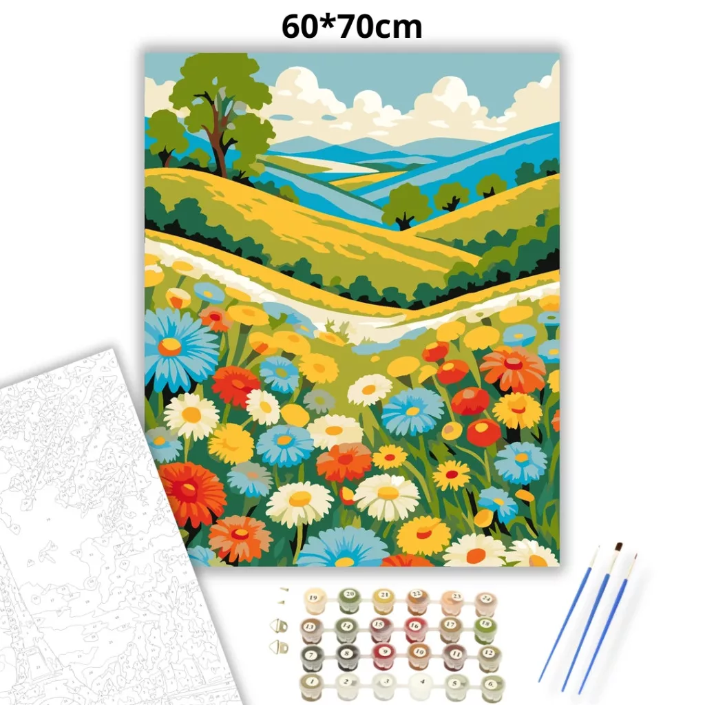 Egy tavaszi virágmező tárul elénk, tele színes vadvirágokkal és élénk réti növényekkel. A háttérben dombok, távoli hegyek és egy kanyargó vízfelület látható, fölöttük puha felhőkkel. Az összhatás friss, napfényes és üde hangulatú. Díszítsd otthonodat saját kézzel készített műalkotással, vagy ajándékozd meg szeretteidet egy igazán különleges élménnyel! A számfestő készletben minden szükséges eszköz megtalálható a festmény elkészítéséhez.