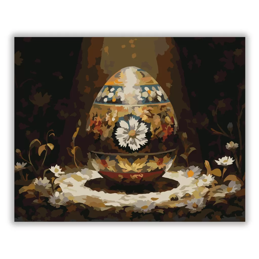 A képen egy díszített tojás látható, rajta virágos mintákkal, egy tálban elhelyezve. Körülötte fehér virágok és levelek jelennek meg, sötétebb háttér előtt. A meleg földszínek és a finom részletek nyugodt, ünnepi hangulatot adnak. Ez a számfestő készlet tökéletes választás, ha egyedi dekorációval tennéd szebbé otthonodat, vagy ha különleges ajándékot keresel. A csomagban minden megtalálható, amire a festéshez szükséged van.