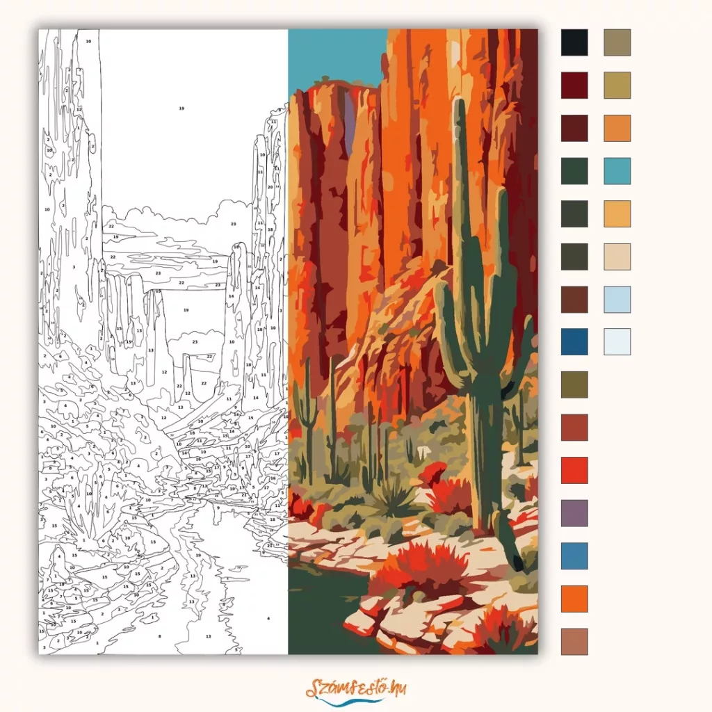 A képen magas, narancsos sziklafalak között kanyargó folyó látható, a parton több kaktusszal és pirosan virágzó növényekkel. A távoli sziklatornyok és a tiszta égbolt tágas, vadregényes hangulatot adnak. Meleg földszínek és friss kék víz teszik igazán látványossá a tájat. Legyen a lakásod dísze vagy egy kedves meglepetés valaki számára – ez a számfestő készlet tökéletes választás mindkettőre. A készletben mindent megtalálsz, amivel lépésről lépésre megalkotható ez a gyönyörű festmény.