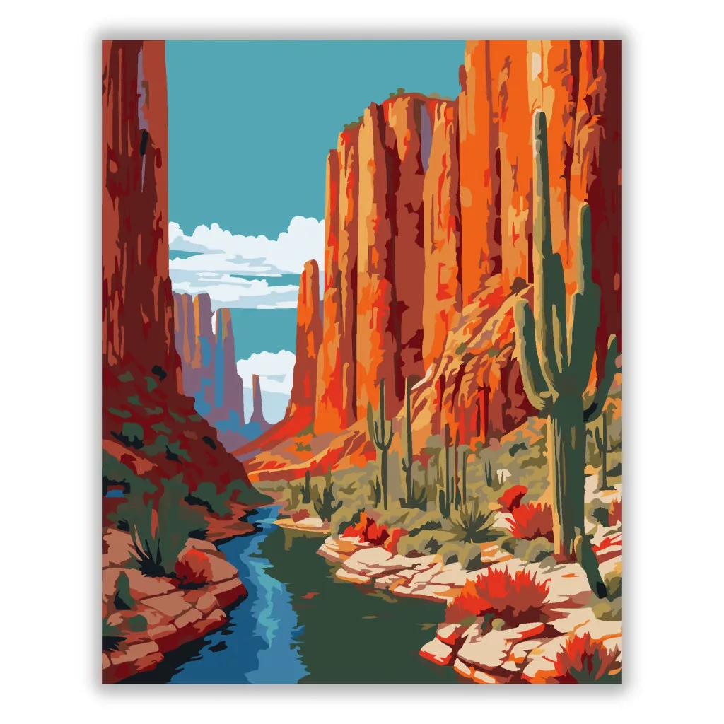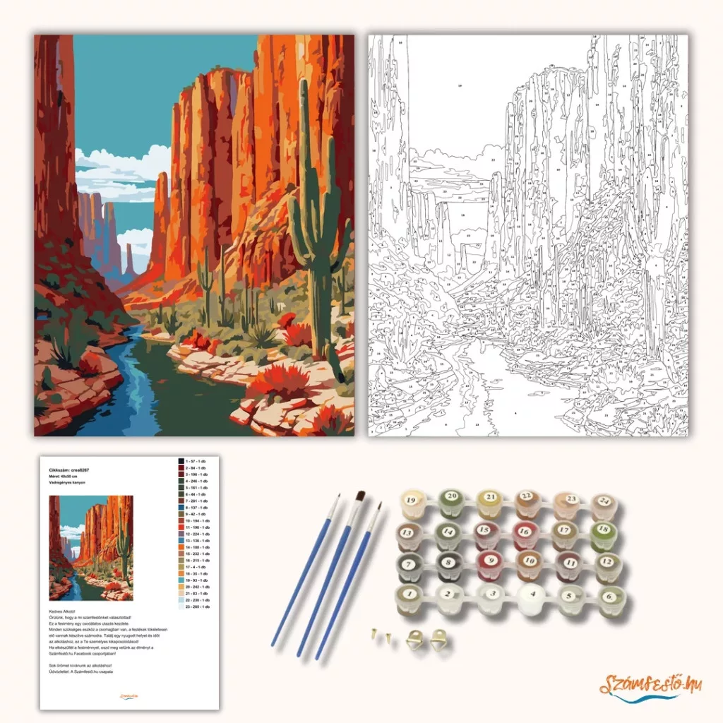 A képen magas, narancsos sziklafalak között kanyargó folyó látható, a parton több kaktusszal és pirosan virágzó növényekkel. A távoli sziklatornyok és a tiszta égbolt tágas, vadregényes hangulatot adnak. Meleg földszínek és friss kék víz teszik igazán látványossá a tájat. Legyen a lakásod dísze vagy egy kedves meglepetés valaki számára – ez a számfestő készlet tökéletes választás mindkettőre. A készletben mindent megtalálsz, amivel lépésről lépésre megalkotható ez a gyönyörű festmény.